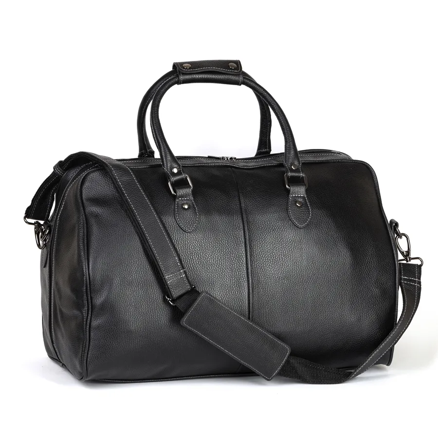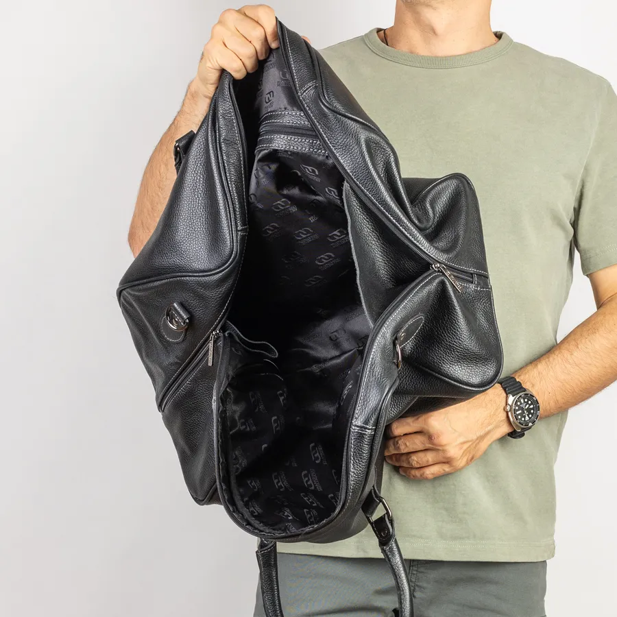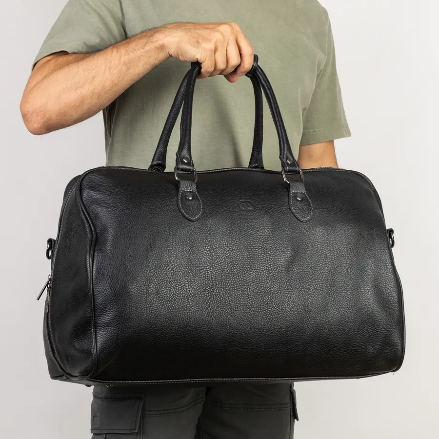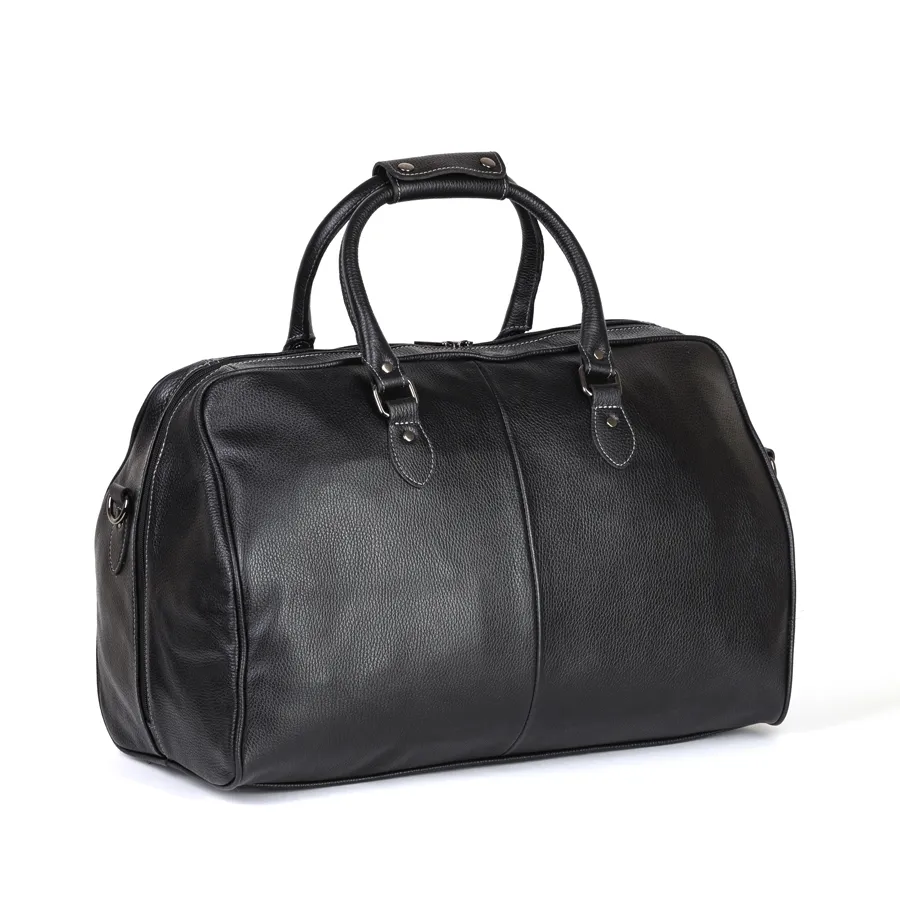 Дорожная сумка бренда Francesco Molinary из натуральной кожи с зернистой структурой. Прошита фирменной подкладочной тканью. Имеет вшитые кожаные ручки с возможностью их соединить с помощью застежки. В наличии одно большое отделение под молнией, внутри которого есть карман на молнии. В комплект входит прицепной плечевой ремень. Снизу есть металлические ножки, чтобы можно было поставить сумку на твердую поверхность