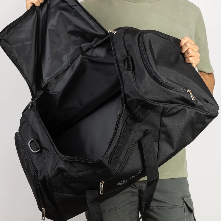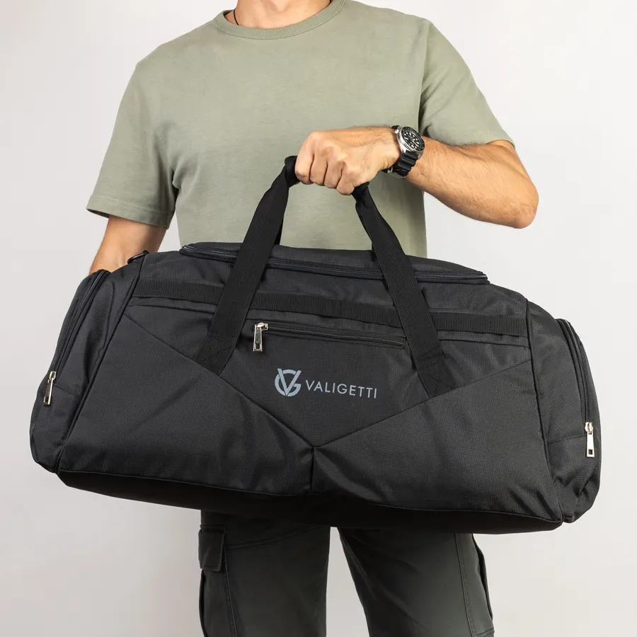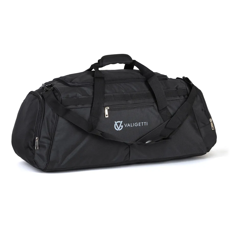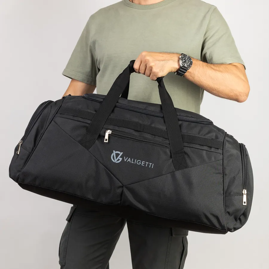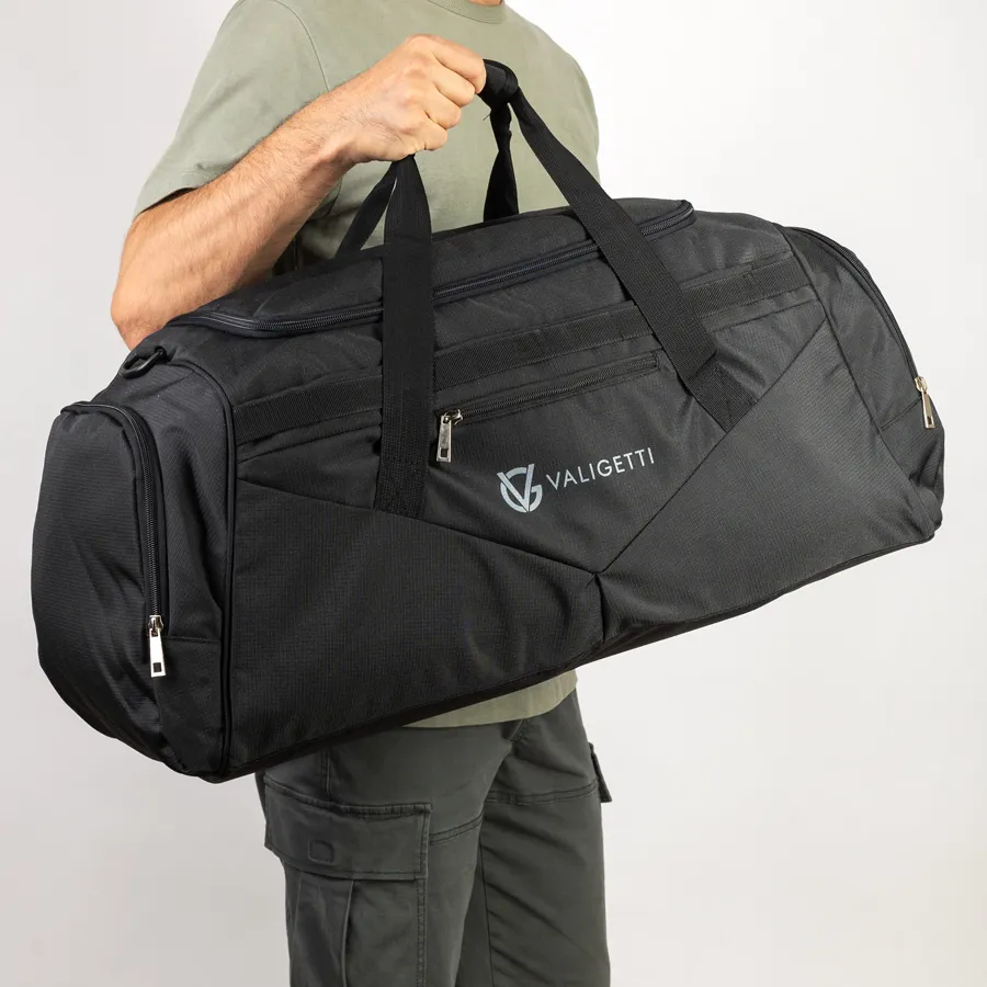 Сумка от торговой марки Valigetti выполнена из практичного текстильного материала черного цвета. Модель с двумя ручками и длинным регулируемым плечевым ремнем. Закрывается клапаном на молнии. По бокам - карманы на молнии. Спереди - карман на молнии.