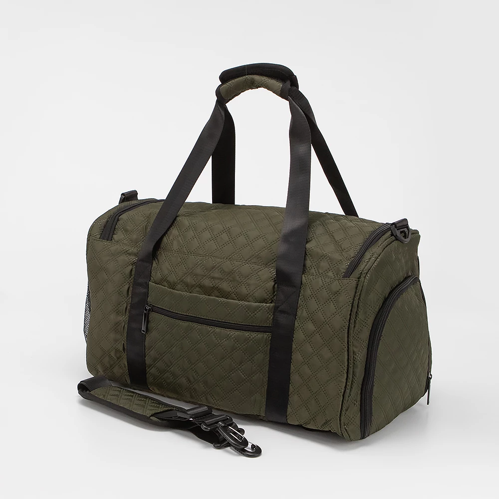 Дорожно-спортивная сумка от бренда Valigetti выполнена из плотного практичного текстильного материала зеленого цвета. Вместительная модель с двумя длинными ручками с фиксатором на липучке и съемным регулируемым плечевым ремнем с наплечником. Отделение на молнии. Внутри: текстильная подкладка, карман на молнии, накладные карманы. Сбоку — карман для обуви и карман-сетка. С лицевой стороны — два объемных кармана с клапаном на застежке фастекс и два кармана на молнии. На задней стороне — карман на молнии и лямка для крепления на выдвижную ручку чемодана.