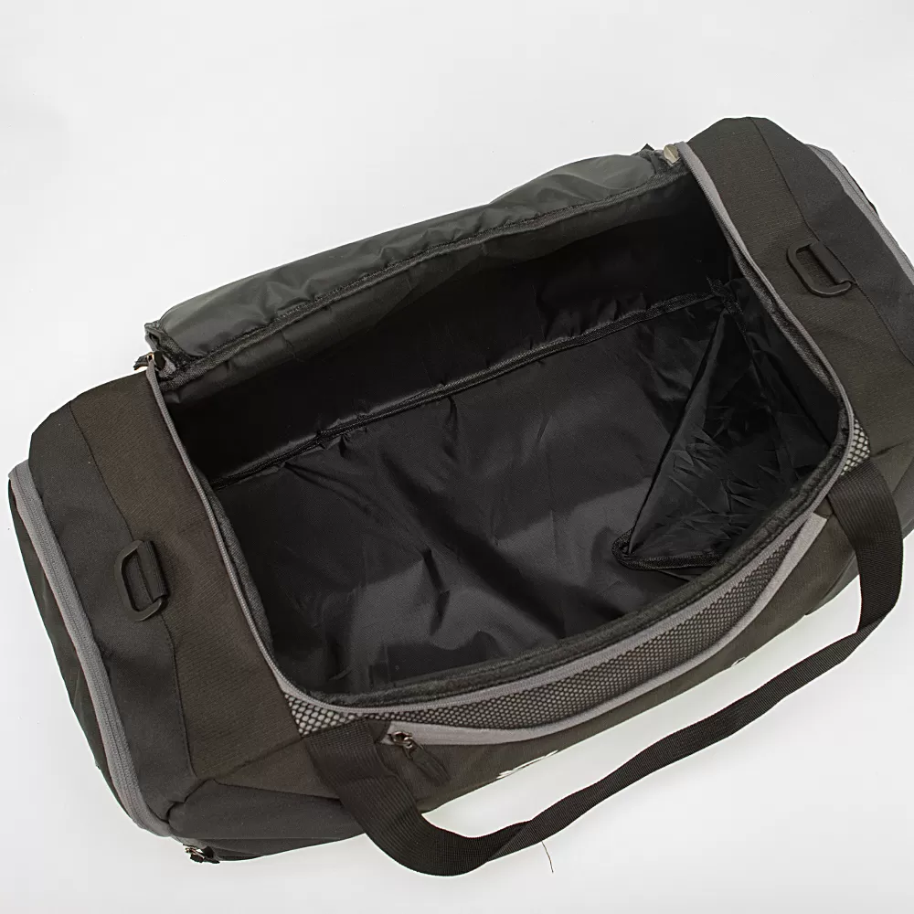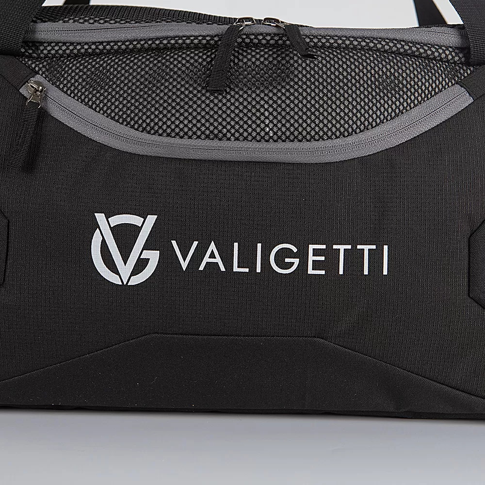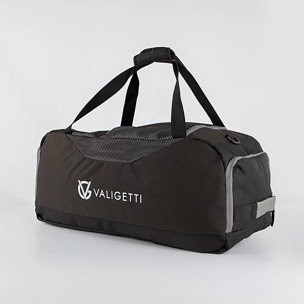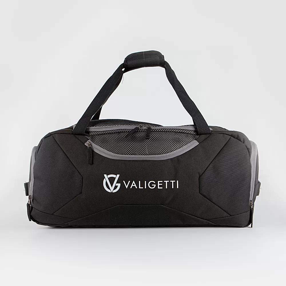 Текстильная дорожно-спортивная сумка Valigetti выполнена в серых и черных цветах. Модель оснащена двумя ручками, которые фиксируются липучкой, и регулируемым плечевым ремнем с мягким наплечником. По бокам расположены ручки для удобной переноски. Сумка имеет два боковых кармана – один для обуви, второй для мелочей. Также на лицевой стороне расположен карман на молнии для хранения мелких предметов. Основное отделение закрывается клапаном на молнию.