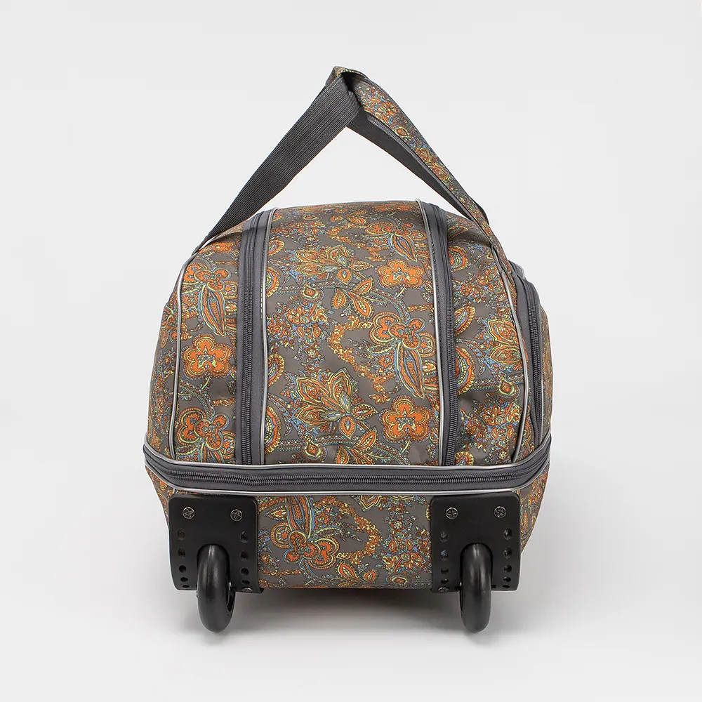 Дорожно-спортивная сумка на колёсах от торговой марки Mr.Bag выполнена из текстильной ткани жатка цвета хаки. Модель с двумя колесами, для надежности утопленными в корпус, с выдвижной ручкой, двумя удлиненными ручками с фиксатором, ручкой с прорезиненной накладкой сбоку. Закрывается клапаном на молнии. На лицевой стороне – карман на молнии. Имеется раздвижка на молнии для увеличения объема. Сбоку и на дне – круглая пластиковая ножка для устойчивости и защиты от износа.