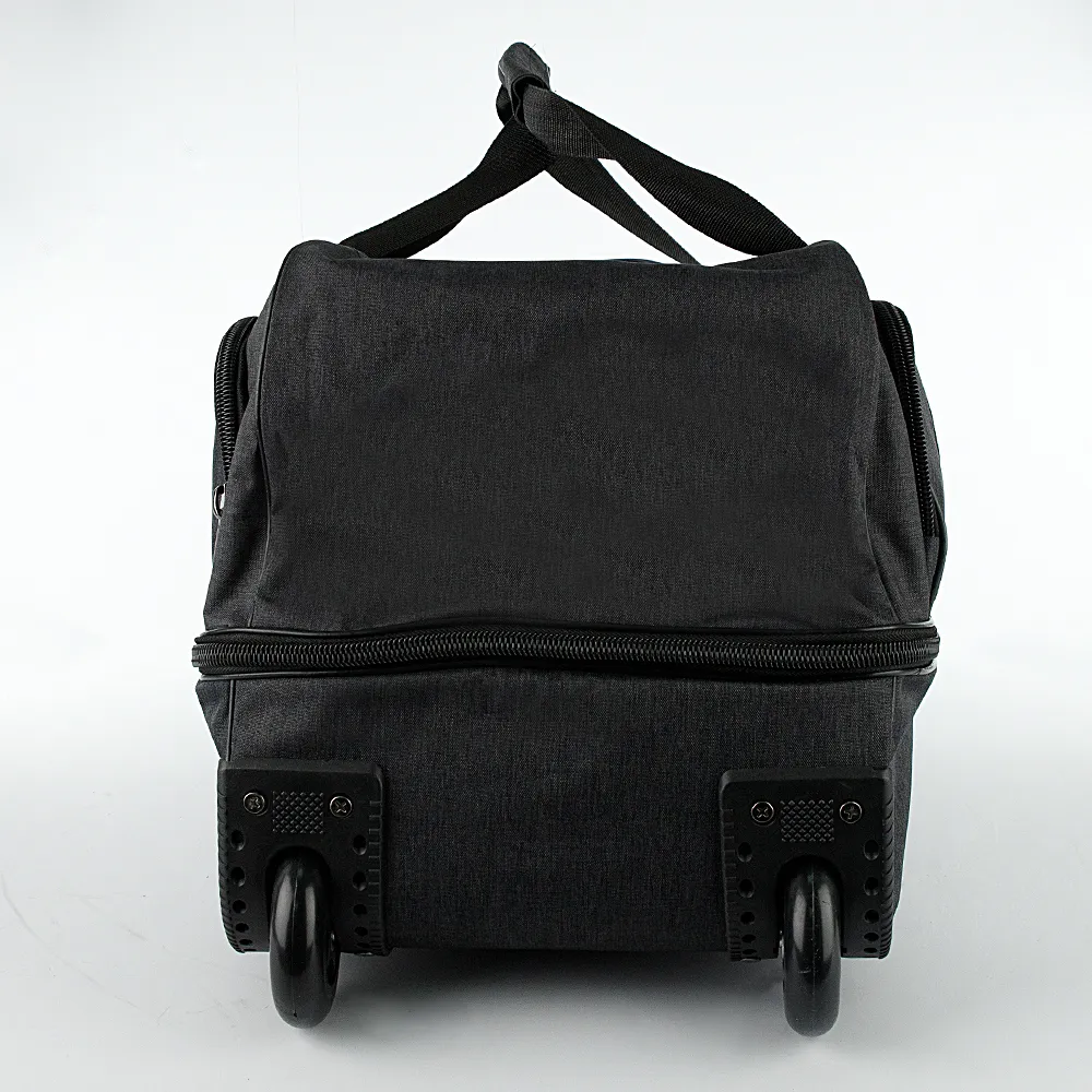 Дорожная сумка на колёсах от торговой марки Mr.Bag выполнена из практичного текстильного материала серого цвета с мягкой ромбовидной стежкой. Модель на двух колесах, для надежности утопленных в корпус, с выдвижной ручкой, двумя удлиненными ручками с фиксатором на липучке, двумя ручками по бокам и ручкой сверху. Закрывается клапаном на круговой молнии. Отделение без подкладки. На лицевой стороне – накладной карман на молнии, на задней – карман на молнии. Имеется раздвижка на молнии для увеличения объема. Дно сумки оснащено большой круглой пластиковой ножкой. Сумка весом 2,4 кг рассчитана на объем до 106,5 литров.