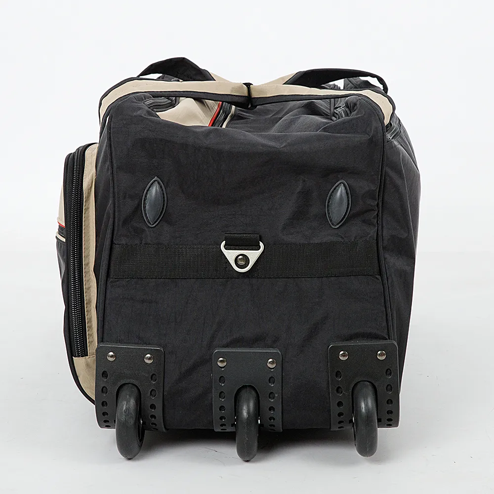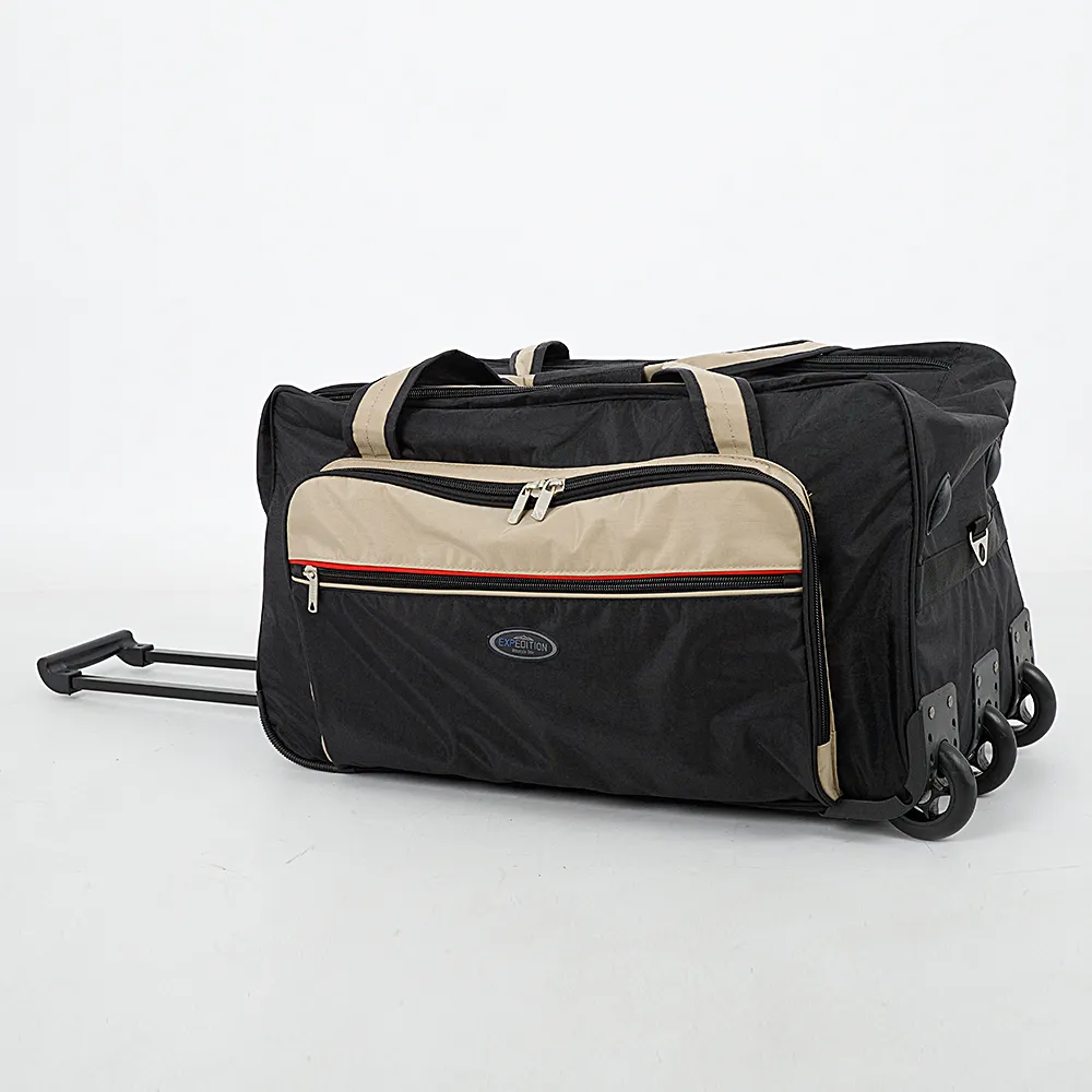 Большая вместительная сумка-тележка от бренда Mr.Bag выполнена из текстильного материала синего цвета с элементами серого и красного. Отделение с текстильной подкладкой, с карманами на молнии и без. На клапане сверху имеется карман на молнии. На передней стороне – два кармана на молнии. Имеются две ручки переноски на фиксаторе, ручка-переноска сбоку, выдвижная ручка, плечевой ремень. Дно сумки и бок оснащены ножками от износа. Сбоку: три утопленных колеса.