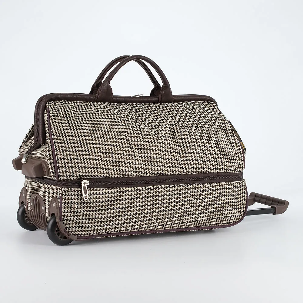 Дорожная сумка-саквояж от торговой марки TSV из плотного материала и искусственной кожи в сочетании бежевого и коричневого цвета с принтом «гусиная лапка». Вместительная модель на двух колесах с выдвижной ручкой, ручкой-переноской, с двумя плотными ручками, пластиковой ножкой на дне, ножками-опорами и держателем в нижней части. Отделение на молнии с рамочным открытием. Внутри: карман. На лицевой стороне – карман на молнии. Имеется раздвижка на молнии для увеличения объема. Вес сумки 2,02 кг.