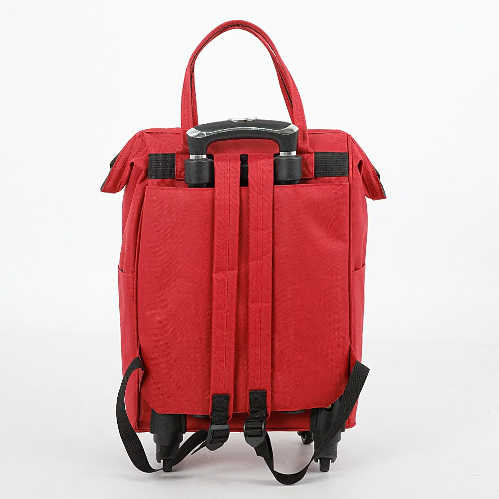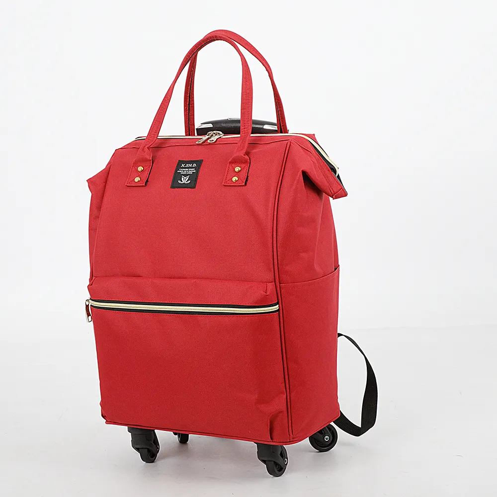 Функциональная сумка-рюкзак от торговой марки Xinshengda из плотного текстильного материала бордового цвета. Модель на четырех колесах, с выдвижной ручкой, двумя удлиненными ручками и регулируемыми плечевыми лямками. Отделение на молнии широко раскрывается. Внутри: текстильная подкладка. На лицевой стороне – накладной карман на молнии. По бокам – карманы без застежки. Вес сумки – 2,05 кг.