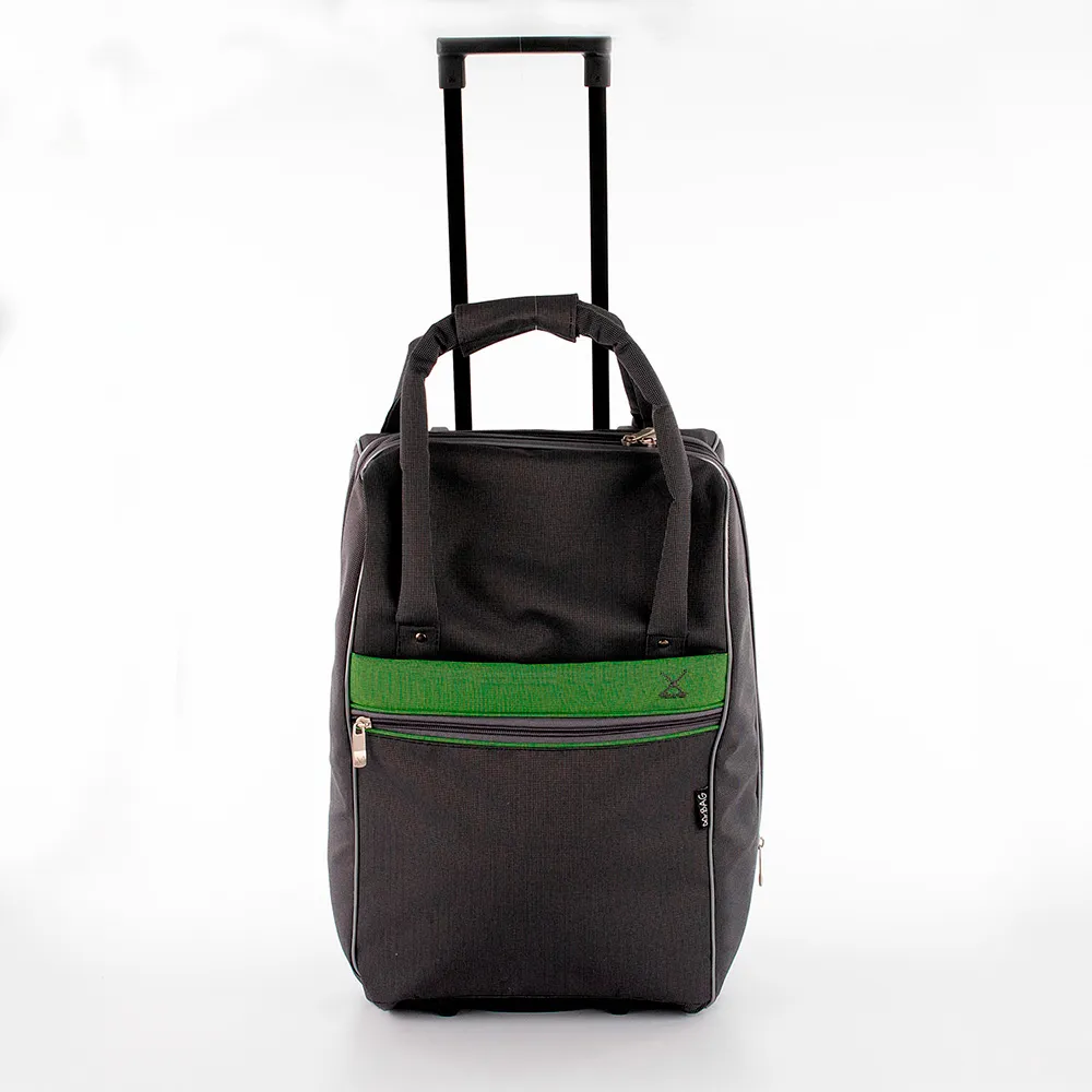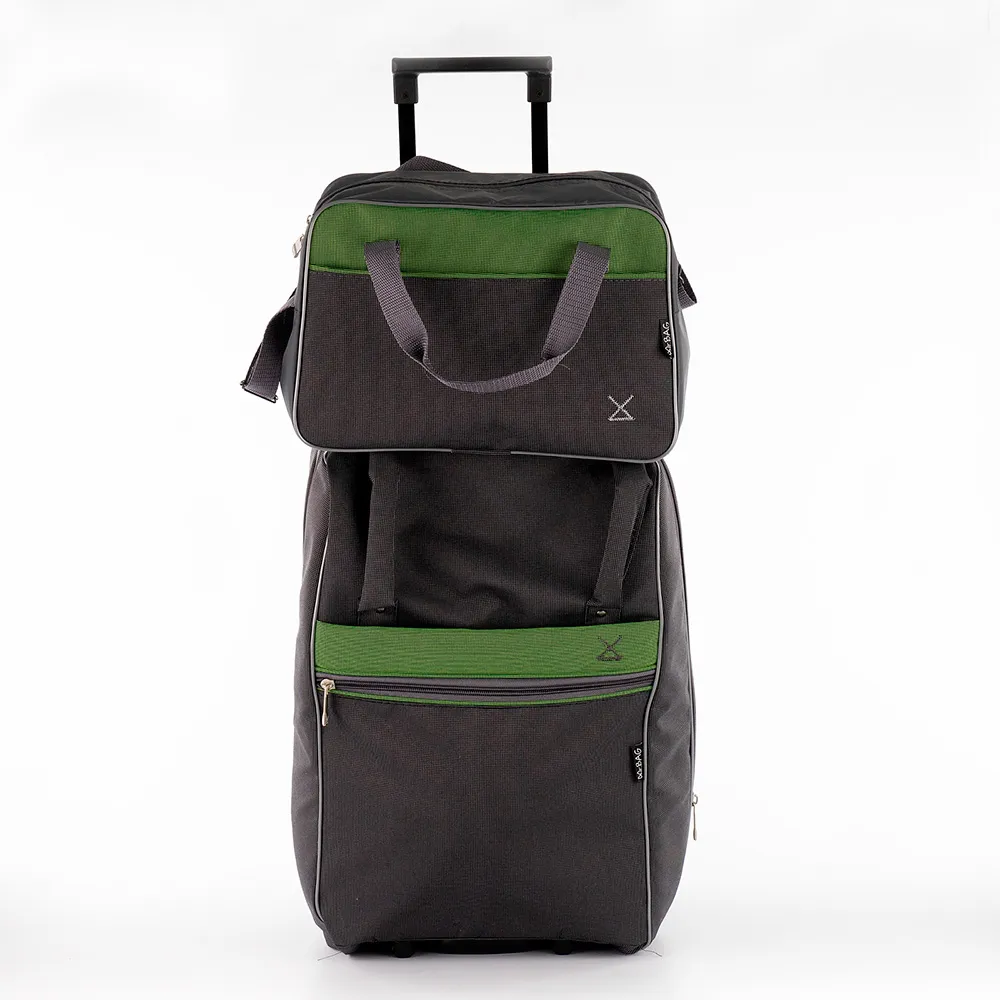Набор от торговой марки Mr.Bag, состоящий из сумки-тележки и сумки, выполнен из практичного текстильного материала серого цвета с салатовыми вставками. Сумка-тележка на двух колесах, для надежности утопленных в корпус, с держателем-опорой, с выдвижной ручкой, двумя ручками с фиксатором на липучке, большой круглой ножкой на дне. Отделение на молнии. Внутри: текстильная подкладка, в одной из частей – фиксирующие ремни. Имеется раздвижка на молнии для увеличения объема. На лицевой стороне – два кармана на молнии. На выдвижную ручку с помощью лямки крепится компактная сумка. Модель с двумя ручками и несъемным регулируемым плечевым ремнем. Отделение на молнии. Внутри: карман на молнии. На лицевой стороне – карман на молнии.