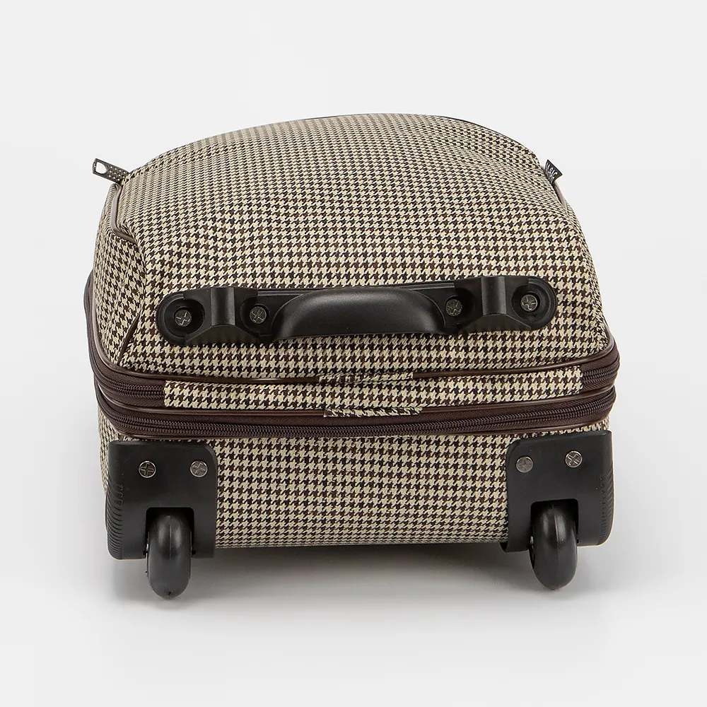 Сумка-тележка от торговой марки Mr.Bag из практичного текстильного материала коричневого цвета с принтом гусиная лапка. Модель на двух колесах, утопленных в корпус, с выдвижной ручкой, двумя ручками с фиксатором на липучке, пластиковыми ножками и держателем на дне. Отделение на молнии широко раскрывается на 180 градусов. Внутри: текстильная подкладка, перекрестные ремни для фиксации багажа в обеих частях. Имеется раздвижка для увеличения объема. На лицевой стороне - карман на молнии.