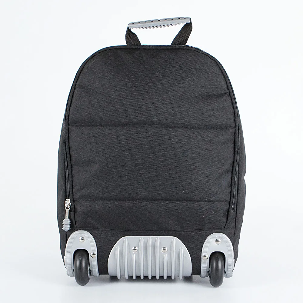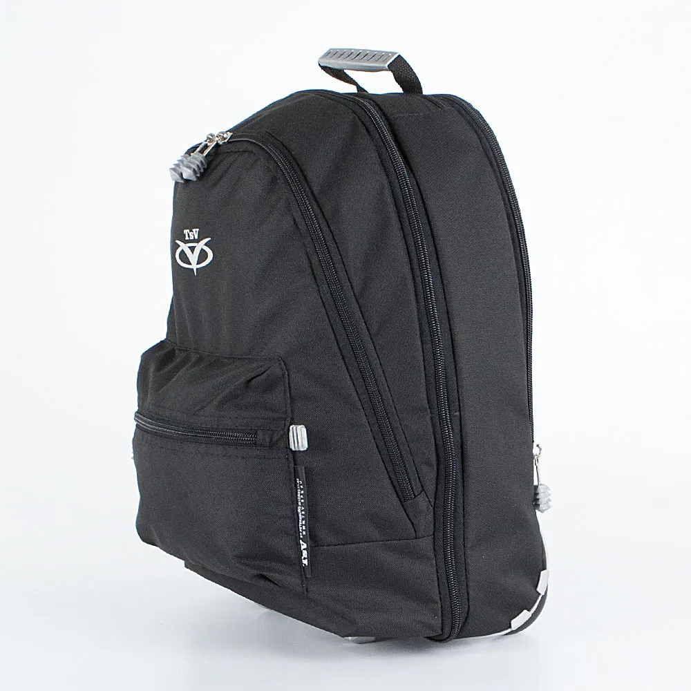 Сумка-рюкзак от торговой марки TSV из плотного высокопрочного текстильного материала в черном цвете с серыми деталями. Модель с выдвижной ручкой, скрытой карманом на молнии, с ручкой-переноской, регулируемыми плечевыми лямками, которые складываются в задний карман на молнии, с двумя одинарными скрытыми колесами. Отделение на молнии без подкладки. На лицевой стороне – накладной карман на молнии. Имеется раздвижка на молнии для увеличения объема. На дне – пластиковый держатель, выполняющий также роль ножки-опоры, и пластиковая накладка, усиливающая дно и защищающая рюкзак от износа.