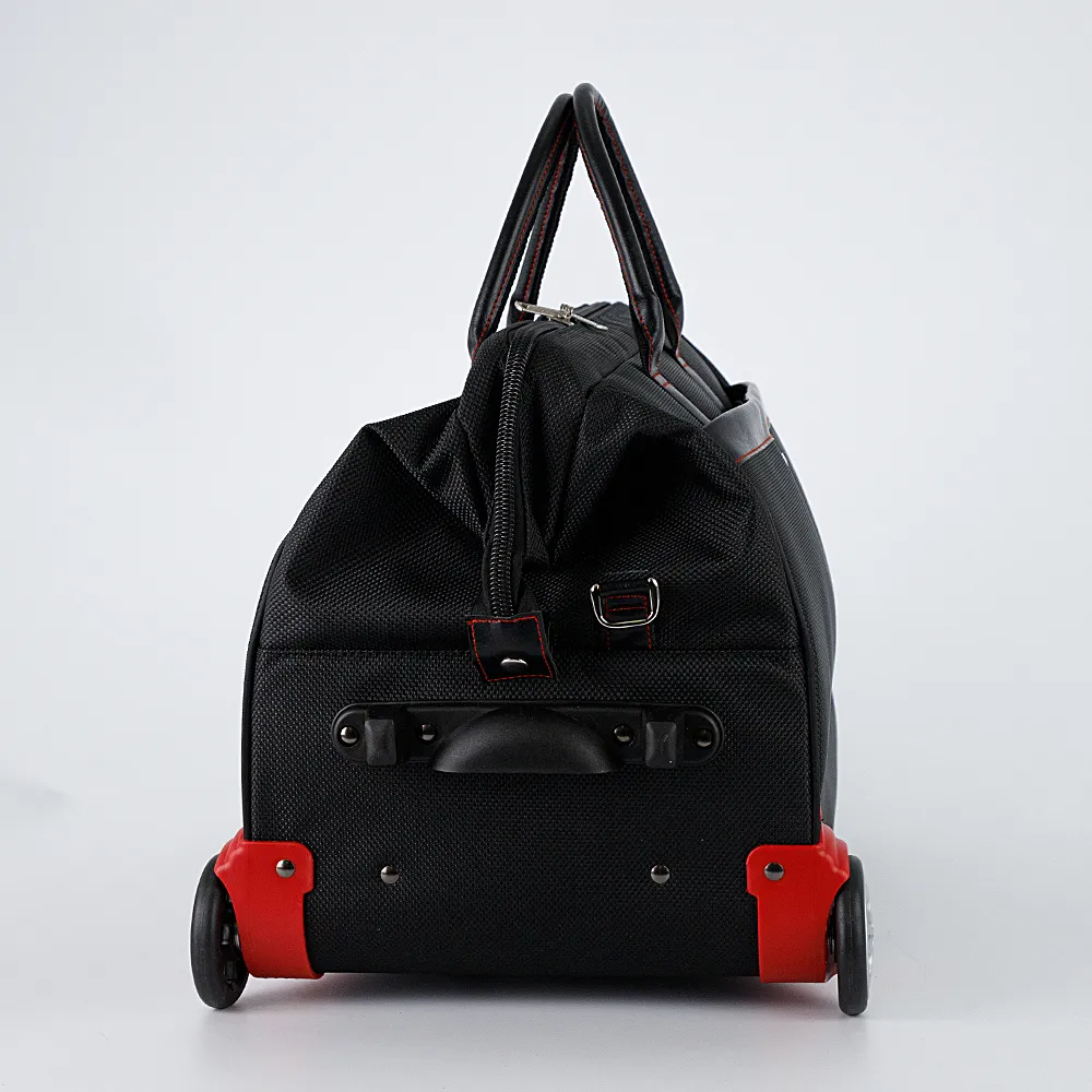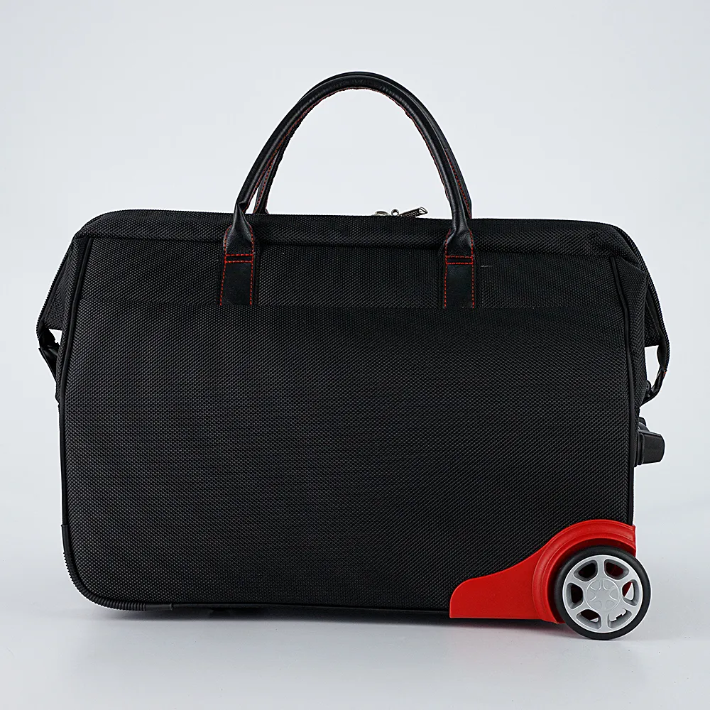 Дорожная сумка-саквояж на колесах от бренда Росин выполнена из практичного полиэстера и искусственной кожи чёрного цвета. Модель с рамочной конструкцией; на двух колесах, утопленных в корпус, с двумя плотными ручками, выдвижной ручкой, съемным плечевым ремнем, пластиковыми ножками, ножкой-держателем. Отделение на молнии, с текстильной подкладкой и карманом на молнии. На лицевой стороне – карман на молнии.