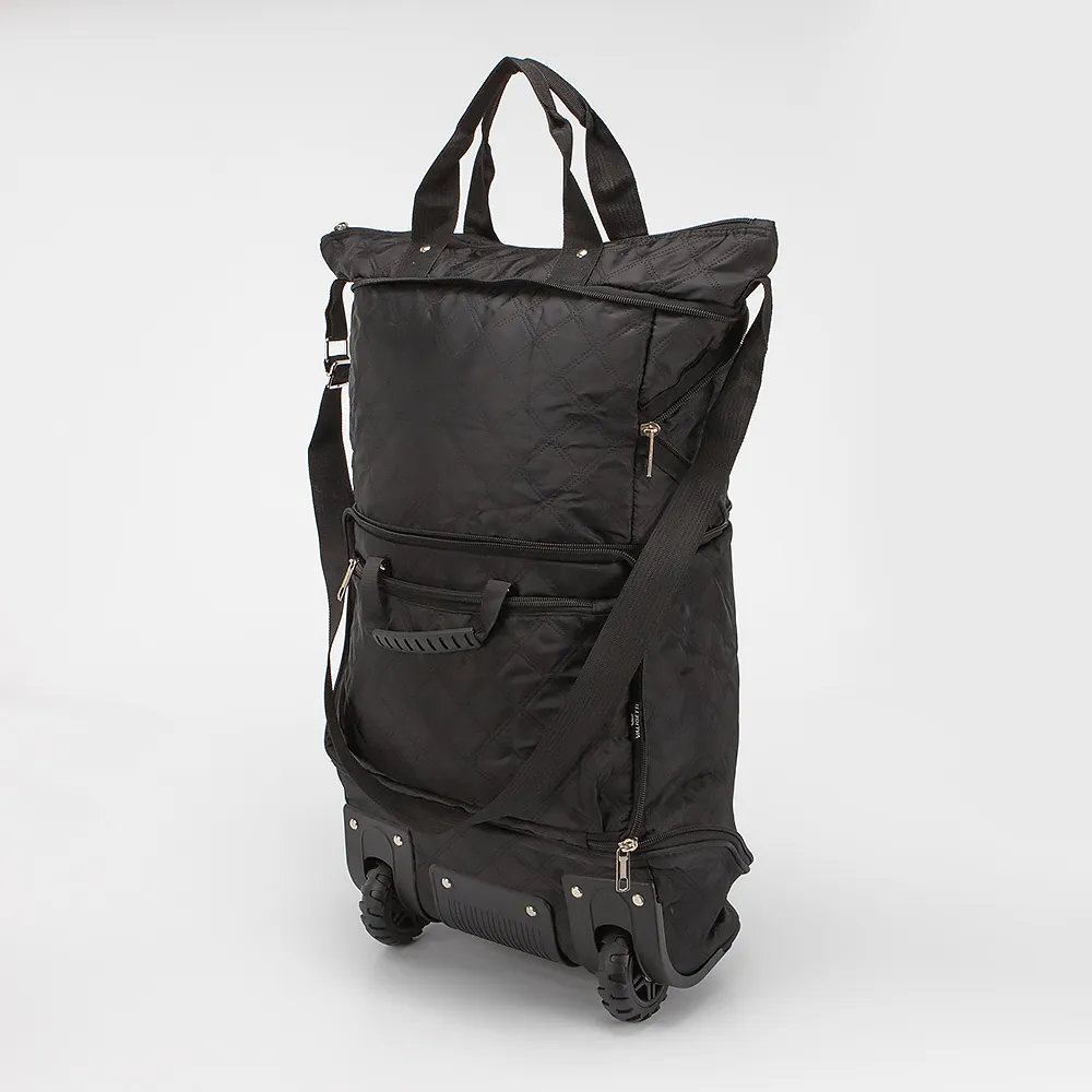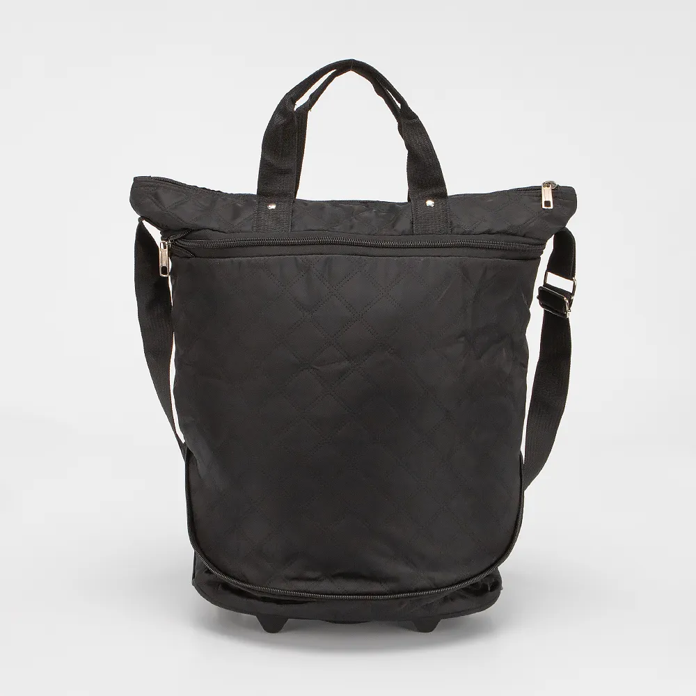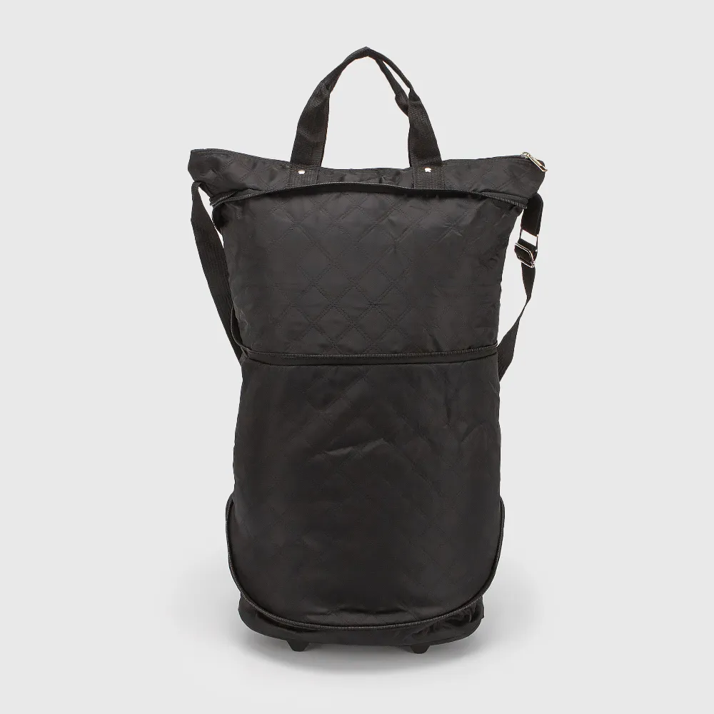Практичная хозяйственная сумка от торговой марки Valigetti выполнена из плотной текстильной ткани черного цвета. Модель-трансформер с двумя колесами, утопленными в корпус. В сложенном виде компактна и имеет ручку переноску и карман на молнии. В разложенном виде возможно два варианта сложения благодаря раздвижке на молнии. Сумка с двумя ручками, несъемным регулируемым плечевым ремнем. Глубокое отделение на молнии. На задней стороне - карман на молнии. На дне имеются ножки-держатели.