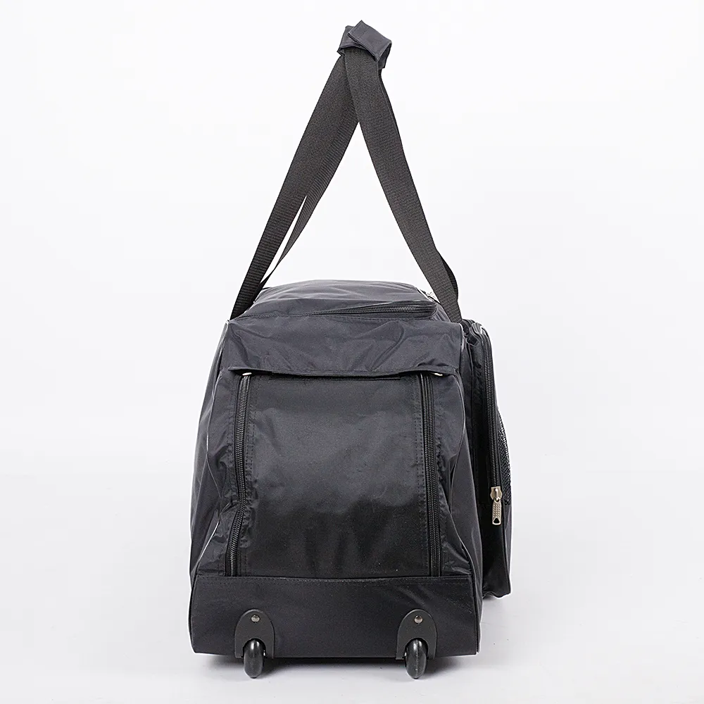 Спортивная сумка на колесах от торговой марки Mr.Bag из прочного практичного текстильного материала черного цвета. Модель для занятий хоккеем, на двух колесах, утопленных в корпус, с двумя удлиненными ручками и ручкой-переноской сбоку. Закрывается клапаном на молнии. Вместительное отделение без подкладки. По бокам – карманы с двумя молниями и клапаном на липучке; в одном из карманов имеется сетчатая вставка для вентиляции. На лицевой стороне – три фигурных кармана на молнии с сетчатыми вставками. Дно оснащено прорезиненными накладками для защиты от износа. Сумка весом 2,62 кг рассчитана на объем 17 литров.