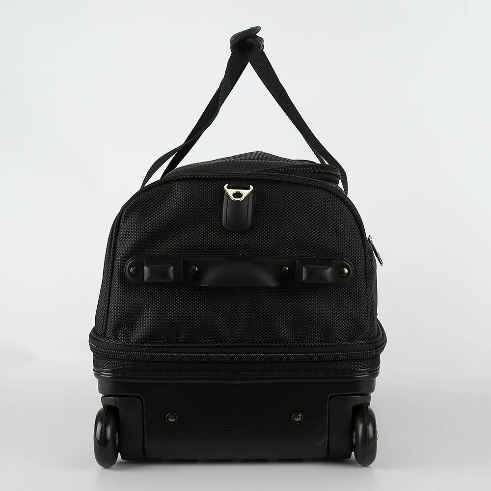 Функциональная дорожно-спортивная сумка на колесах от торговой марки Rion выполнена из прочного долговечного полиэстера коричневого цвета. Модель с глубоким пластиковым дном, с усиленным каркасом на двух колесах, для надежности, утопленных в корпус, с выдвижной телескопической ручкой, двумя удлиненными ручками с фиксатором на липучке, съемным плечевым ремнем с прорезиненным наплечником, пластиковыми ножками на дне и сбоку, боковым пластиковым держателем. Два отделения на молнии. Нижнее отделение широко раскрывается. Верхнее закрывается клапаном, внутри – карман на молнии. На лицевой стороне – карман на молнии. Сумка весом 3 кг рассчитана на объем 66 литров.