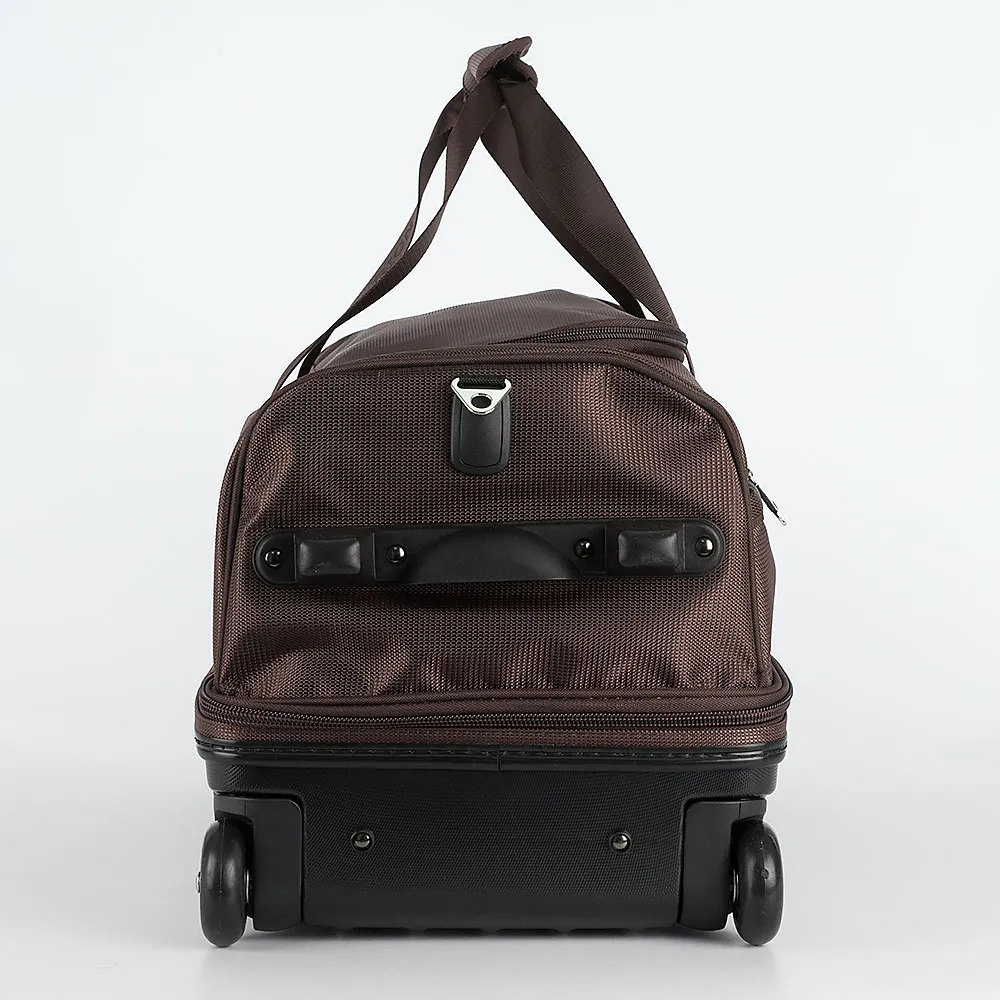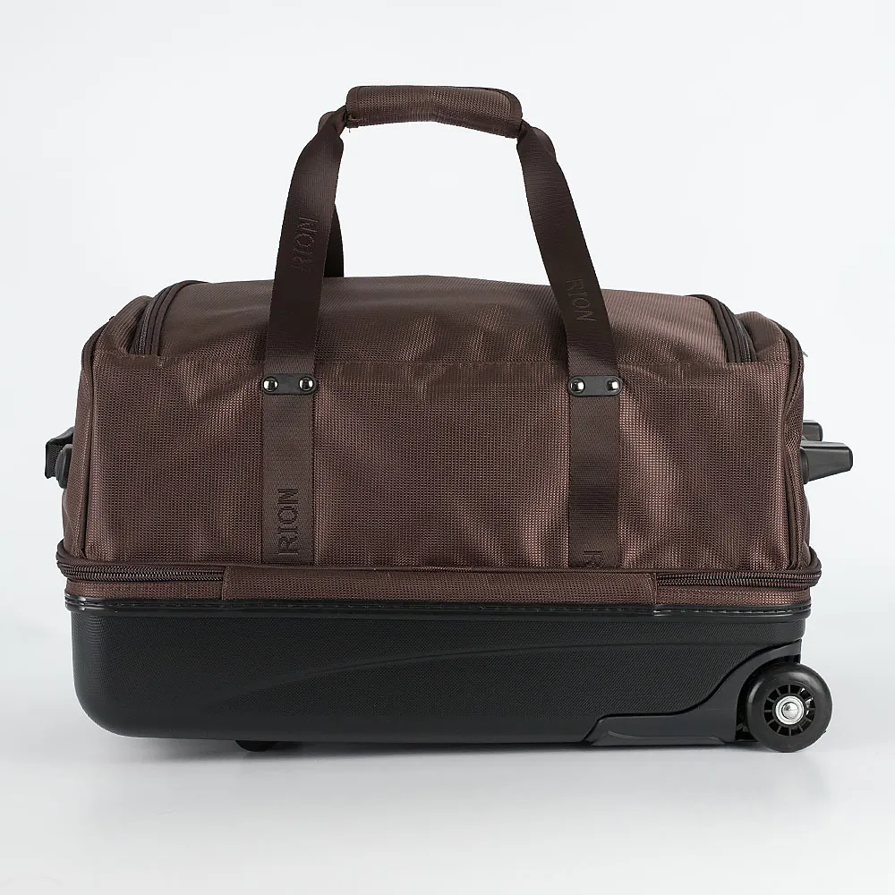 Функциональная дорожно-спортивная сумка на колесах от торговой марки Rion выполнена из прочного долговечного полиэстера коричневого цвета. Модель с глубоким пластиковым дном, с усиленным каркасом на двух колесах, для надежности, утопленных в корпус, с выдвижной телескопической ручкой, двумя удлиненными ручками с фиксатором на липучке, съемным плечевым ремнем с прорезиненным наплечником, пластиковыми ножками на дне и сбоку, боковым пластиковым держателем. Два отделения на молнии. Нижнее отделение широко раскрывается. Верхнее закрывается клапаном, внутри – карман на молнии. На лицевой стороне – карман на молнии. Сумка весом 3 кг рассчитана на объем 66 литров.
