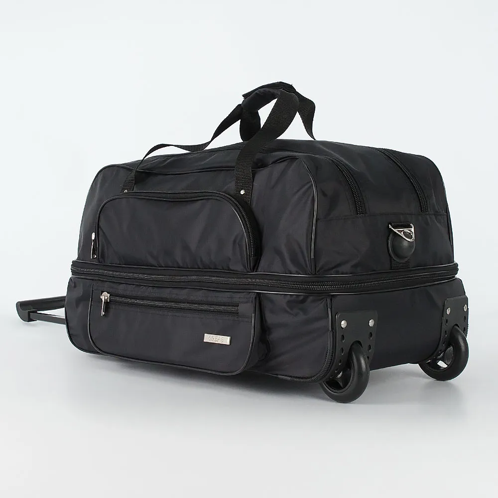 Дорожная сумка на колёсах от торговой марки Mr.Bag выполнена из плотного и практичного текстильного материала синего цвета. Сумка оснащена двумя колёсами, которые для надёжности утоплены в корпус, выдвижной ручкой, двумя ручками с фиксатором на липучке, съемным регулируемым плечевым ремнем, ручкой-переноской, пластиковыми ножками на дне и сбоку. Вместительное отделение закрывается двумя молниями. Внутри: без подкладки. На лицевой стороне – два кармана на молнии. Имеется раздвижка на молнии для увеличения объёма. Сумка весом 990 грамм рассчитана на объем 57,6 литров.