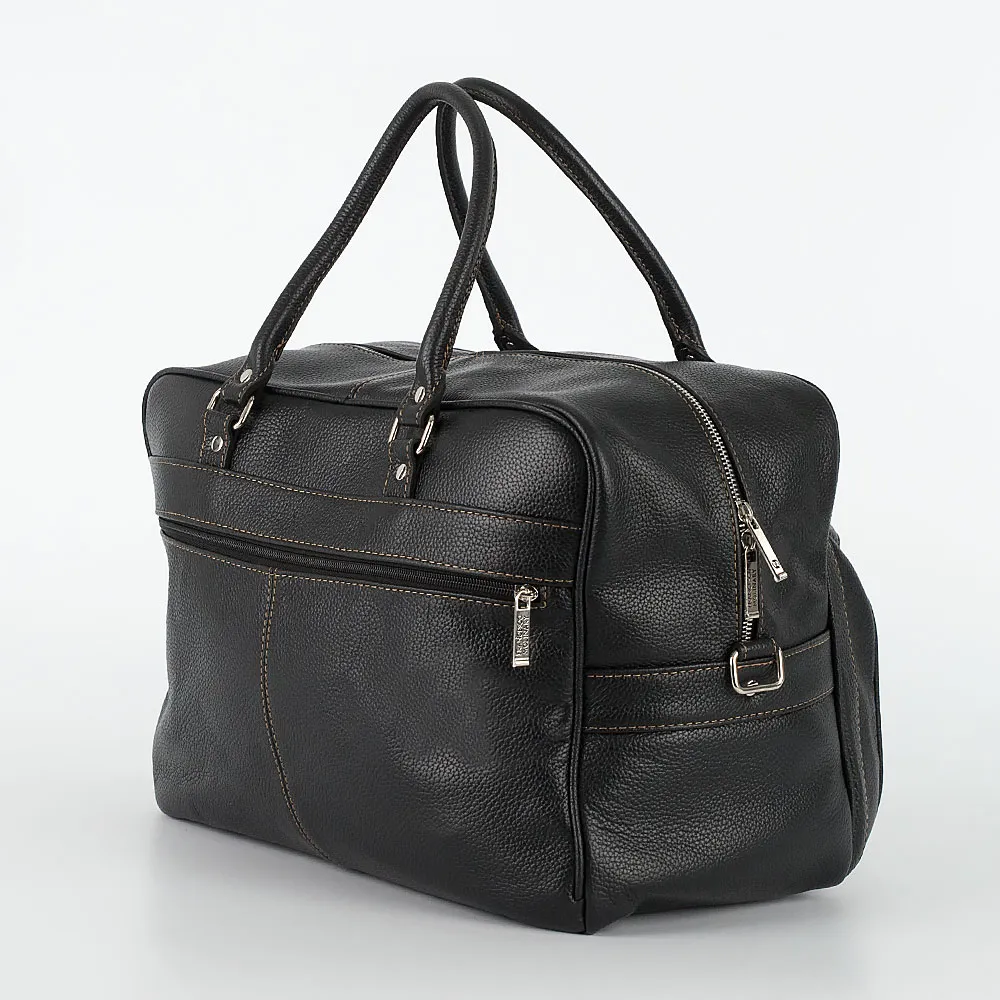 Дорожная сумка от торговой марки Francesco Molinary выполнена из натуральной кожи черного цвета с контрастной отсрочкой. Модель с двумя плотными ручками и съемным регулируемым плечевым ремнем, выполненным из текстильного материала. Отделение на молнии. Внутри: фирменная подкладка, накладной карман. На лицевой и задней сторонах – карман на молнии. Дно оснащено металлическими ножками для защиты от износа. Сумка весом 1,32 кг рассчитана на объем 33,5 литров.