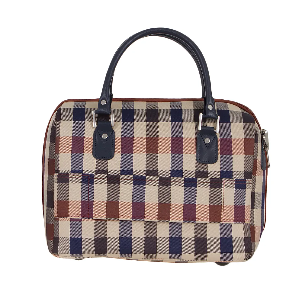 Дорожная сумка от торговой марки Francesco Molinary из плотного текстильного материала синего цвета в красно-белую клетку и искусственной кожи. Модель с двумя ручками и съемным регулируемым плечевым ремнем с наплечником. Отделение на молнии с двумя бегунками, оснащенными «ушками» для навесного замка, не входящего в комплект. Внутри: фирменная подкладка, карман на молнии, накладные карманы. На задней стороне – лямка для крепления на выдвижную ручку чемодана. Дно оснащено пластиковыми ножками для защиты от износа.