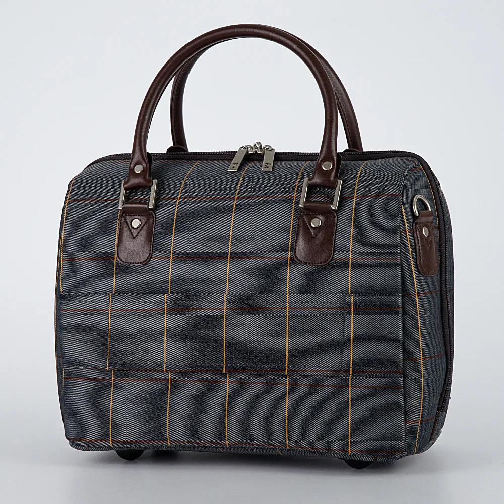 Дорожная сумка от торговой марки Francesco Molinary из плотного текстильного материала синего цвета в красно-белую клетку и искусственной кожи. Модель с двумя ручками и съемным регулируемым плечевым ремнем с наплечником. Отделение на молнии с двумя бегунками, оснащенными «ушками» для навесного замка, не входящего в комплект. Внутри: фирменная подкладка, карман на молнии, накладные карманы. На задней стороне – лямка для крепления на выдвижную ручку чемодана. Дно оснащено пластиковыми ножками для защиты от износа.