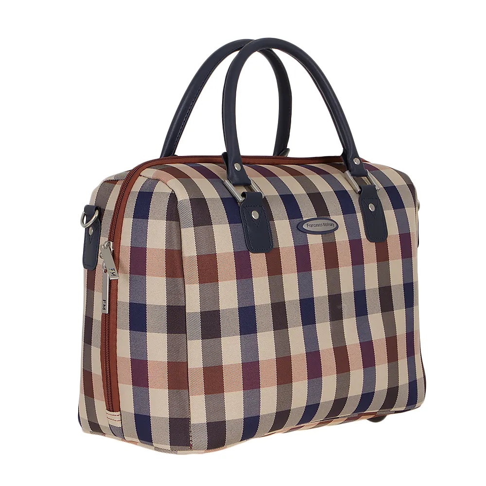 Дорожная сумка от торговой марки Francesco Molinary из плотного текстильного материала синего цвета в красно-белую клетку и искусственной кожи. Модель с двумя ручками и съемным регулируемым плечевым ремнем с наплечником. Отделение на молнии с двумя бегунками, оснащенными «ушками» для навесного замка, не входящего в комплект. Внутри: фирменная подкладка, карман на молнии, накладные карманы. На задней стороне – лямка для крепления на выдвижную ручку чемодана. Дно оснащено пластиковыми ножками для защиты от износа.