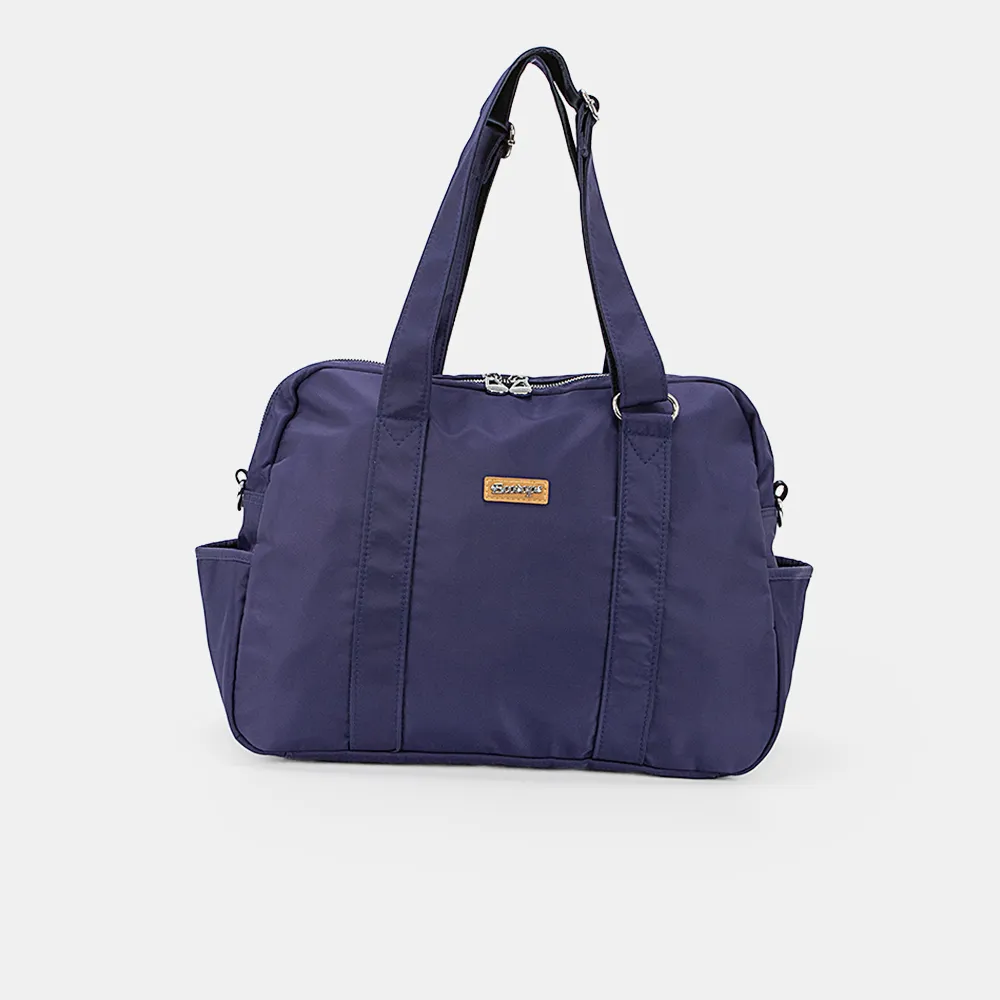 Невероятно лёгкая дорожная сумка Ecotope выполнена из текстильного материала синего цвета с металлической фурнитурой. Помещается в ручную кладь. Имеет две ручки для переноски, которые регулируются по длине и плечевой ремень в комплекте. Застёгивается на молнию, внутри текстильная подкладка и семь карманов. Снаружи два боковых кармана без застёжек.