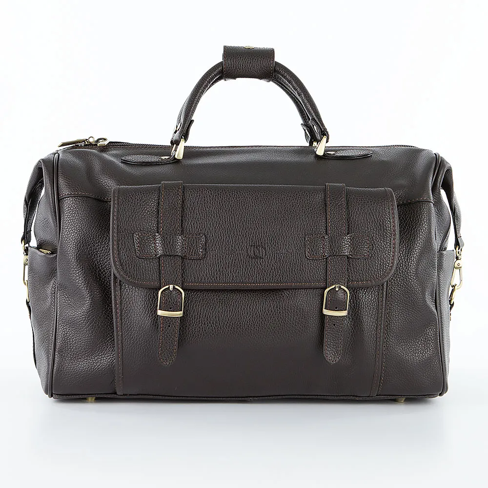 Дорожная сумка от торговой марки Francesco Molinary из натуральной кожи коричневого цвета. Модель с двумя ручками с фиксатором на кнопке и съемным регулируемым плечевым ремнем. Отделение на молнии, которая фиксируется по бокам карабином. Внутри: фирменная подкладка, карман на молнии. На лицевой стороне – вместительный накладной карман с клапаном, декорированным ремешками с пряжками. По бокам – накладной карман. Дно оснащено ножками для защиты от износа.