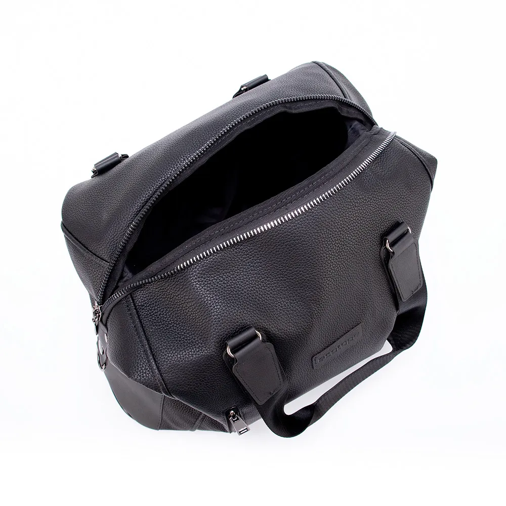 Дорожно-спортивная сумка от торговой марки Ecotope из искусственной кожи черного цвета. Вместительная модель с двумя ручками с фиксатором на кнопке и съемным регулируемым плечевым ремнем. Отделение на молнии. Внутри: частичная подкладка, накладной карман. На лицевой стороне – вертикальный карман на молнии. На задней стороне – карман на молнии. Дно сумки оснащено металлическими ножками для защиты от износа.