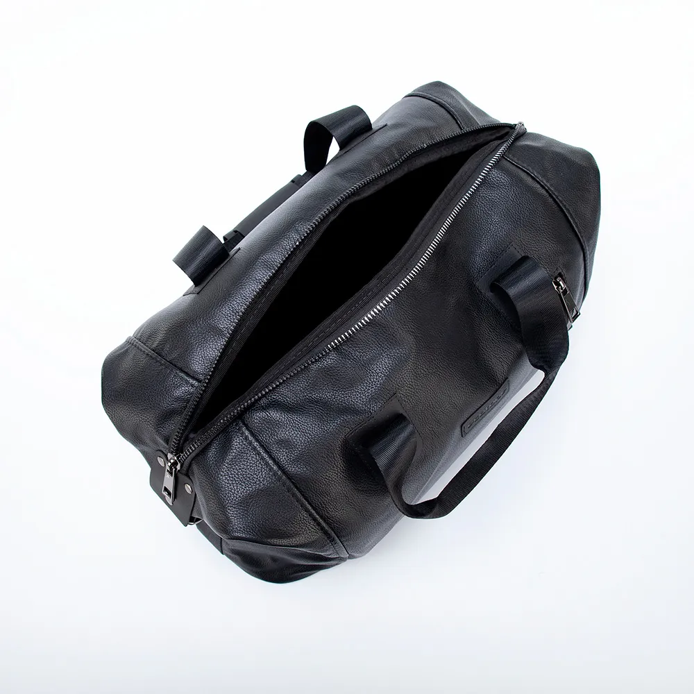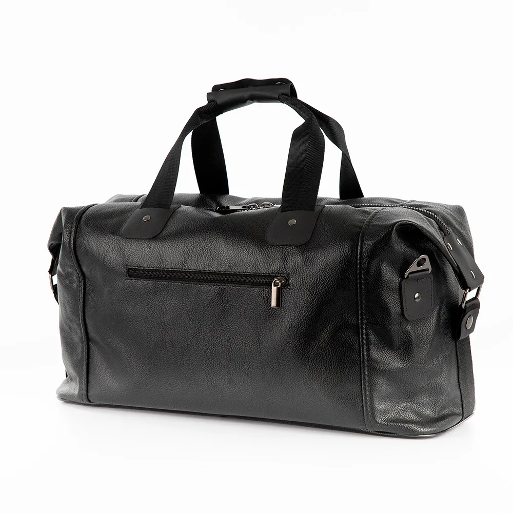 Дорожно-спортивная сумка от торговой марки Ecotope из искусственной кожи черного цвета. Модель с двумя ручками с фиксатором на кнопках и съемным регулируемым плечевым ремнем. Отделение на молнии. Внутри: текстильная подкладка, накладной карман. На лицевой и задней сторонах – карман на молнии. Дно оснащено ножками для защиты от износа.