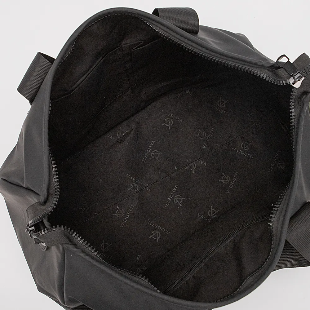 Дорожно-спортивная сумка от торговой марки Valigetti из практичного текстильного материала черного цвета с водоотталкивающей пропиткой. Модель с удлиненными ручками и съемным регулируемым плечевым ремнем. Отделение на молнии. Внутри: текстильная подкладка, карман на молнии, два накладных кармана. На лицевой и задней сторонах – карман на молнии; сзади имеется лямка для крепления на выдвижную ручку чемодана.