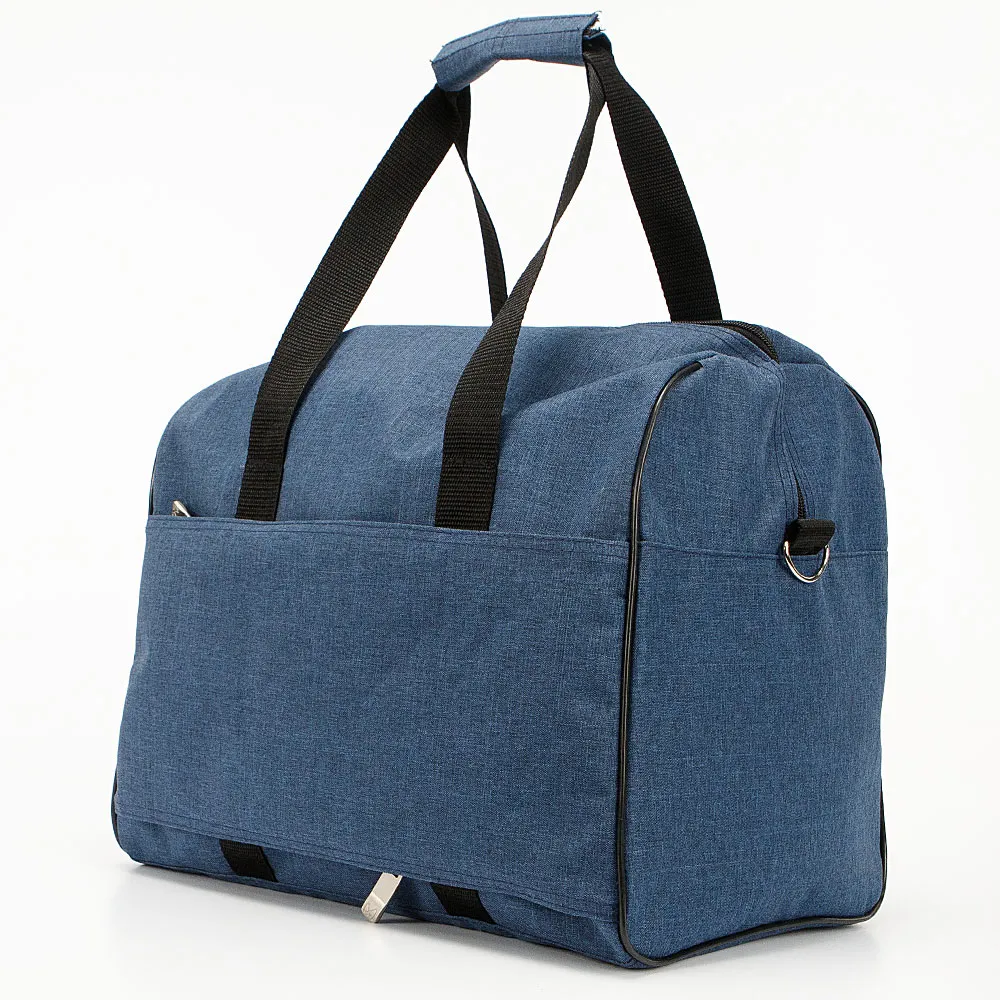 Дорожно-спортивная сумка серии «авиа» от торговой марки Mr.Bag выполнена из плотного и практичного текстильного материала синего цвета. Сумка прямоугольной формы с широким дном, что делает её вместительной. Модель с двумя ручками для переноски с фиксатором на липучке и съемным плечевым ремнем. Отделение на молнии, без подкладки. На передней стороне – карман на молнии, на задней стороне – карман на молнии снизу и сверху. При открытой молнии карман превращается в багажную лямку для крепления сумки на ручку чемодана. Размеры сумки подходят под калибратор для ручной клади авиакомпании «Победа».