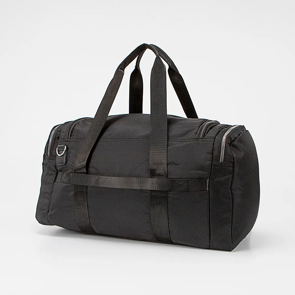 Дорожно-спортивная сумка от торговой марки Valigetti из практичного текстильного материала черного цвета. Модель с двумя ручками и съемным регулируемым плечевым ремнем. Закрывается клапаном на молнии. Внутри: текстильная подкладка, карман на молнии, три накладниых сетчатых кармана. На лицевой стороне – водонепроницаемый карман на молнии. На задней стороне – лямка для крепления на выдвижную ручку чемодана. По бокам – карман на молнии. Дно оснащено прорезиненными накладками для защиты от износа.