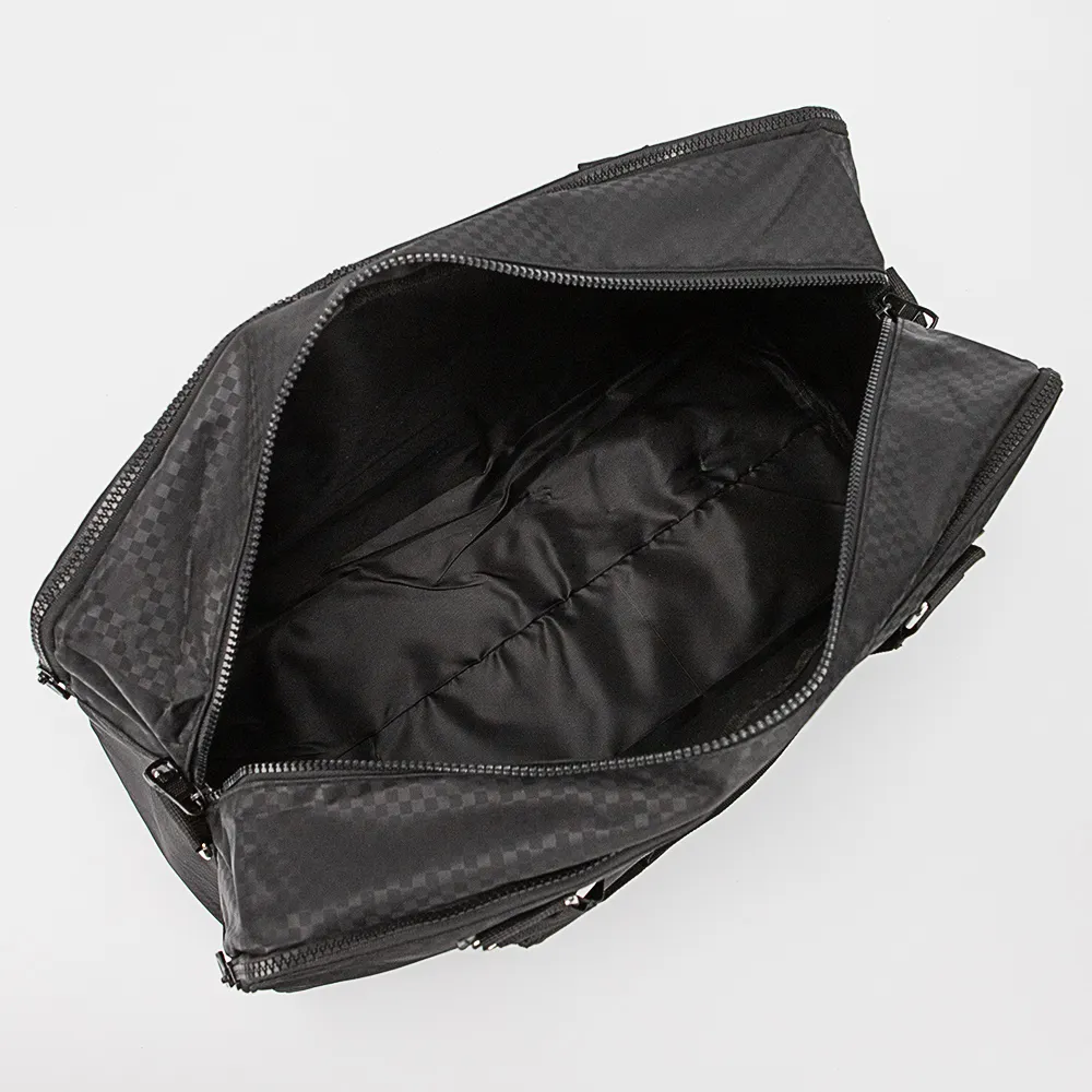 Дорожно-спортивная сумка от торговой марки Valigetti из практичного текстильного материала с шахматным рисунком и искусственной кожи . Модель с двумя ручками и съемным регулируемым плечевым ремнем. Три отделения на молнии. Внутри: текстильная подкладка. На задней стороне – карман на молнии, лямка для крепления на выдвижную ручку чемодана. Дно оснащено круглыми пластиковыми ножками для защиты от износа.