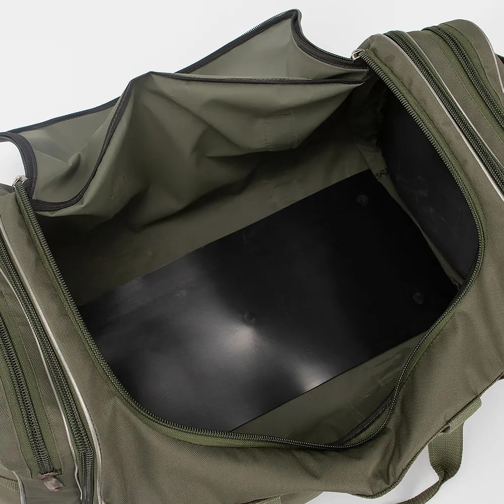 Спортивно-дорожная сумка от Mr.Bag выполнена из плотного текстильного материала цвета хаки. Модель прямоугольной формы, с двумя удлиненными ручками с фиксатором на липучке и съемным плечевым ремнем с резиновым наплечником. Отделение закрывается клапаном на молнии, без подкладки. По бокам-карман на молнии и раздвижка для увеличения объема сумки. На передней стороне-два кармана на молнии и накладной карман с клапаном на застежке фастекс. Дно оснащено пластиковыми ножками для защиты от износа.