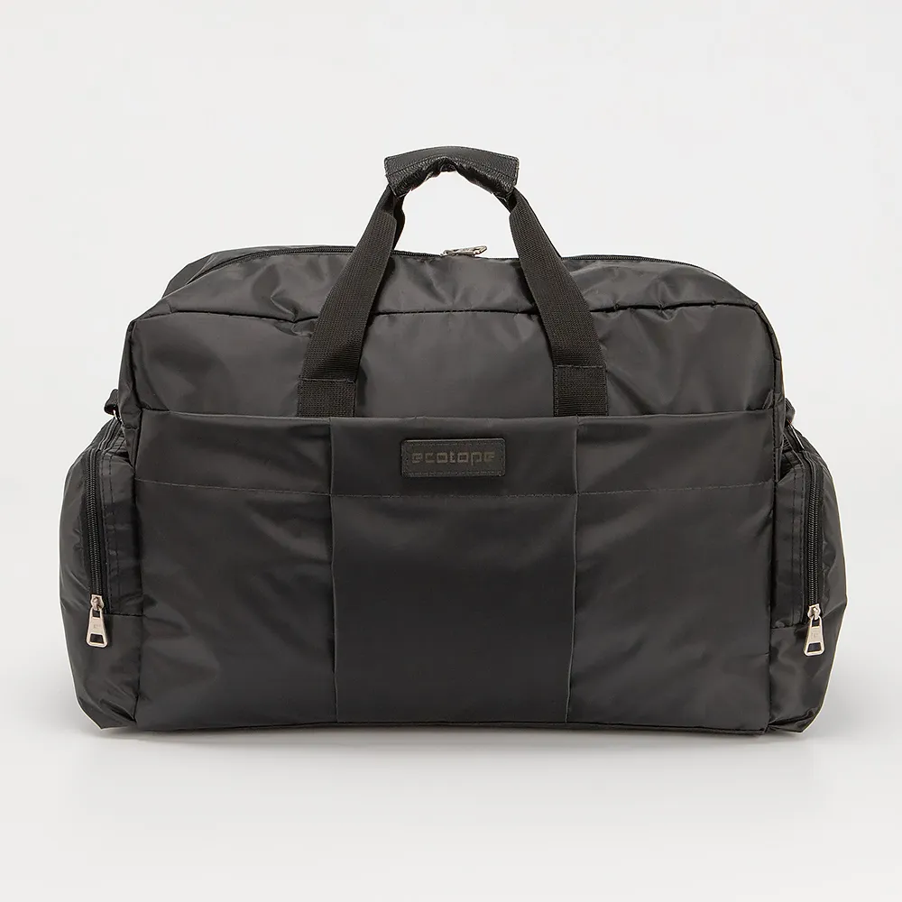 Дорожно-спортивная сумка от торговой марки Ecotope из плотного текстильного материала черного цвета. Вместительная модель с двумя ручками с фиксатором на липучке и съемным плечевым ремнем с наплечником. Отделение на молнии с двумя встречными бегунками. Внутри: текстильная подкладка, карман на молнии, накладной карман. На лицевой стороне - карман со скрытой молнией. По бокам - накладные карманы на молнии.