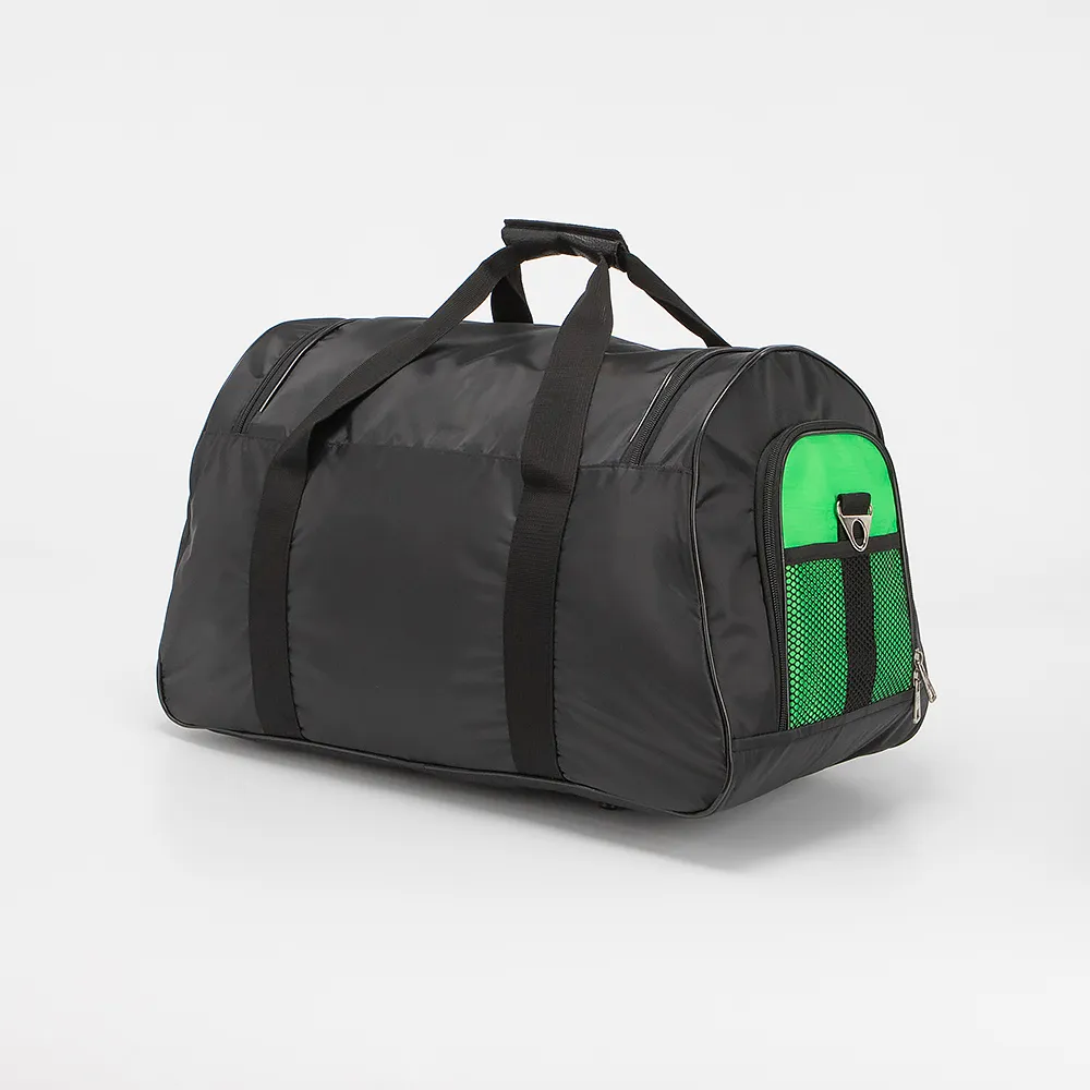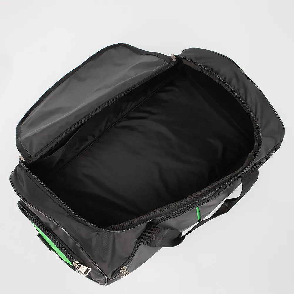 Дорожно-спортивная сумка от торговой марки Ecotope из текстильного материала черного цвета с элементами ярко-зеленого цвета. Модель с двумя ручками с фиксатором на липучке, съемным плечевым ремнем. Клапан на молнии со встречными бегунками закрывает вместительное отделение. Внутри: текстильная подкладка, накладные карманы. По бокам - карман-сетка и карман на молнии. На лицевой стороне - карман на молнии. Дно оснащено пластиковыми ножками для защиты от износа.