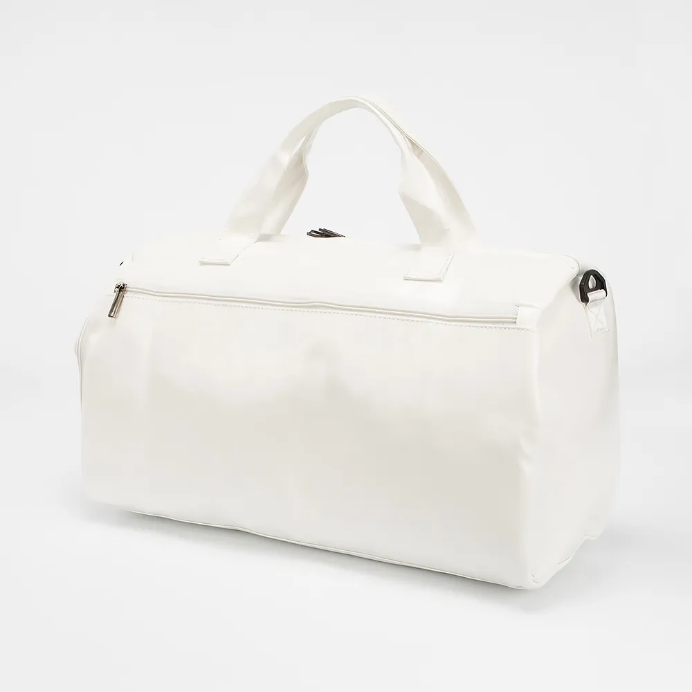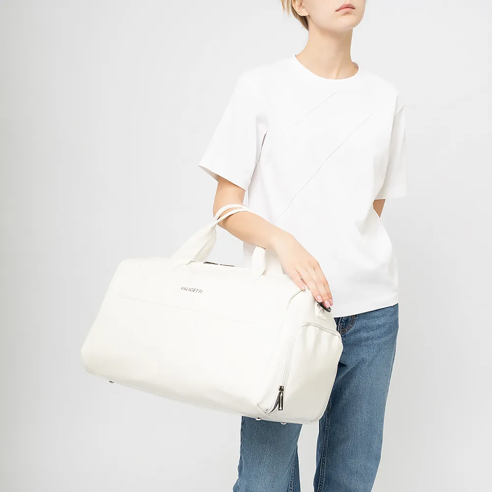 Дорожно-спортивная сумка от торговой марки Valigetti из искусственной кожи белого цвета. Модель с двумя ручками и съемным регулируемым плечевым ремнем. Отделение на молнии. Внутри: текстильная подкладка, карман на молнии. С лицевой стороны - карман с клапаном. Сбоку - откидной карман на молнии. Сзади - карман на молнии. Дно оснащено металлическими ножками для защиты от износа.