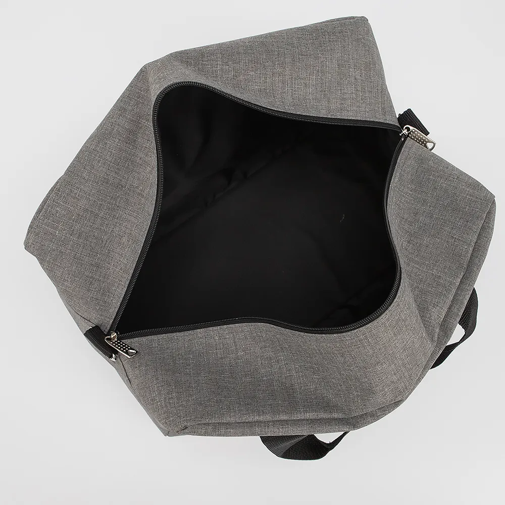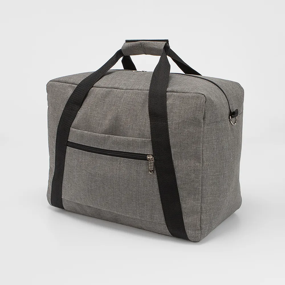 Дорожно-спортивная сумка от торговой марки Mr.Bag выполнена из текстильного материала серого цвета. Модель с двумя ручками с фиксатором на липучке и съемным регулируемым плечевым ремнем. Отделение на молнии с двумя встречными бегунками. На лицевой и задней сторонах сумки - карманы на молнии. Имеется лямка для крепления на выдвижную ручку чемодана.