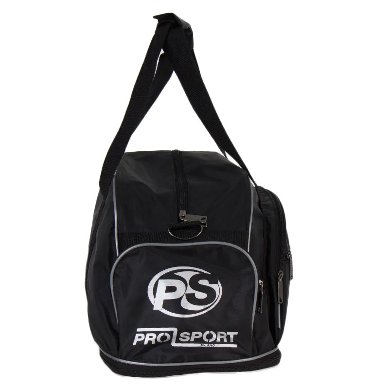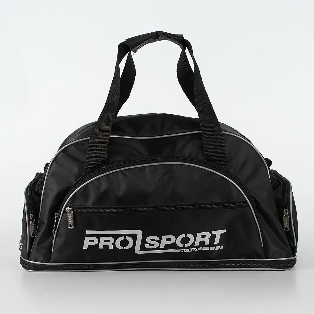 Спортивно-дорожная сумка от Mr.Bag выполнена из плотного текстильного материала черного цвета. Модель в форме купола, с двумя удлиненными ручками и съемным плечевым ремнем, с декоративной окантовкой. Отделение на молнии. По бокам – карманы на молнии. На передней стороне – накладной карман на молнии с прорезным карманом с внешней стороны и декоративная надпись «Pro sport» спереди и по бокам. В нижней части имеется раздвижка на молнии для увеличения объема сумки.