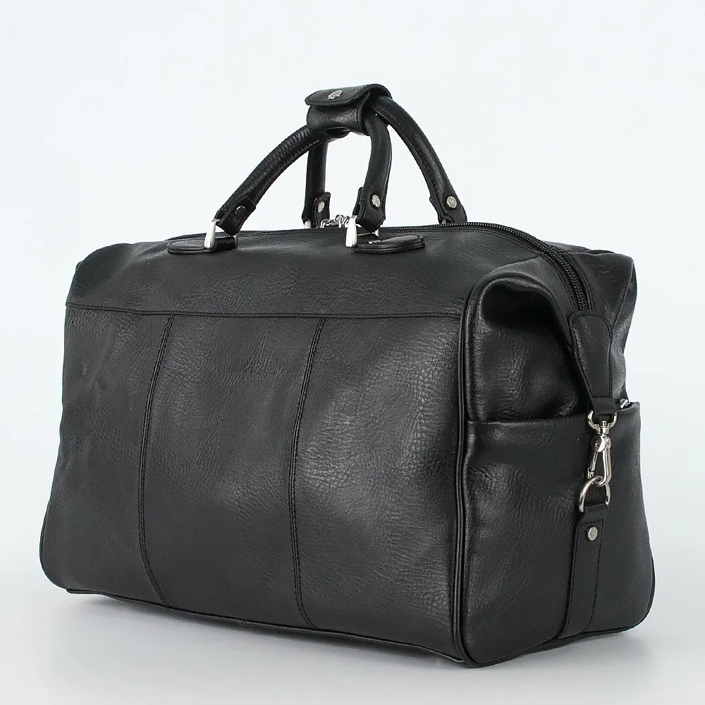 Большая дорожная сумка Francesco Molinary из натуральной кожи черного цвета. Модель с одним отделением на молнии, внутри также есть небольшой прорезной карман на молнии. Снаружи: накладной карман закрывается на откидной клапан на магнитах, декорированный двумя ремнями с серебристыми пряжками. По бокам сумки есть накладные карманы. В комплекте съемный регулируемый плечевой ремень из текстиля и кожи. На дне небольшие металлические «ножки» защищающие от износа.