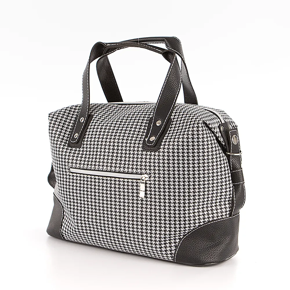 Дорожно-спортивная сумка от торговой марки Passo Avanti из искусственной кожи и текстильного материала черно-белого цвета с принтом «гусиная лапка». Модель с двумя ручками и съемным регулируемым плечевым ремнем. Отделение на молнии. Внутри: текстильная подкладка, накладной карман. На лицевой стороне и задней сторонах – карман на молнии. Дно оснащено металлическими ножками для защиты от износа.