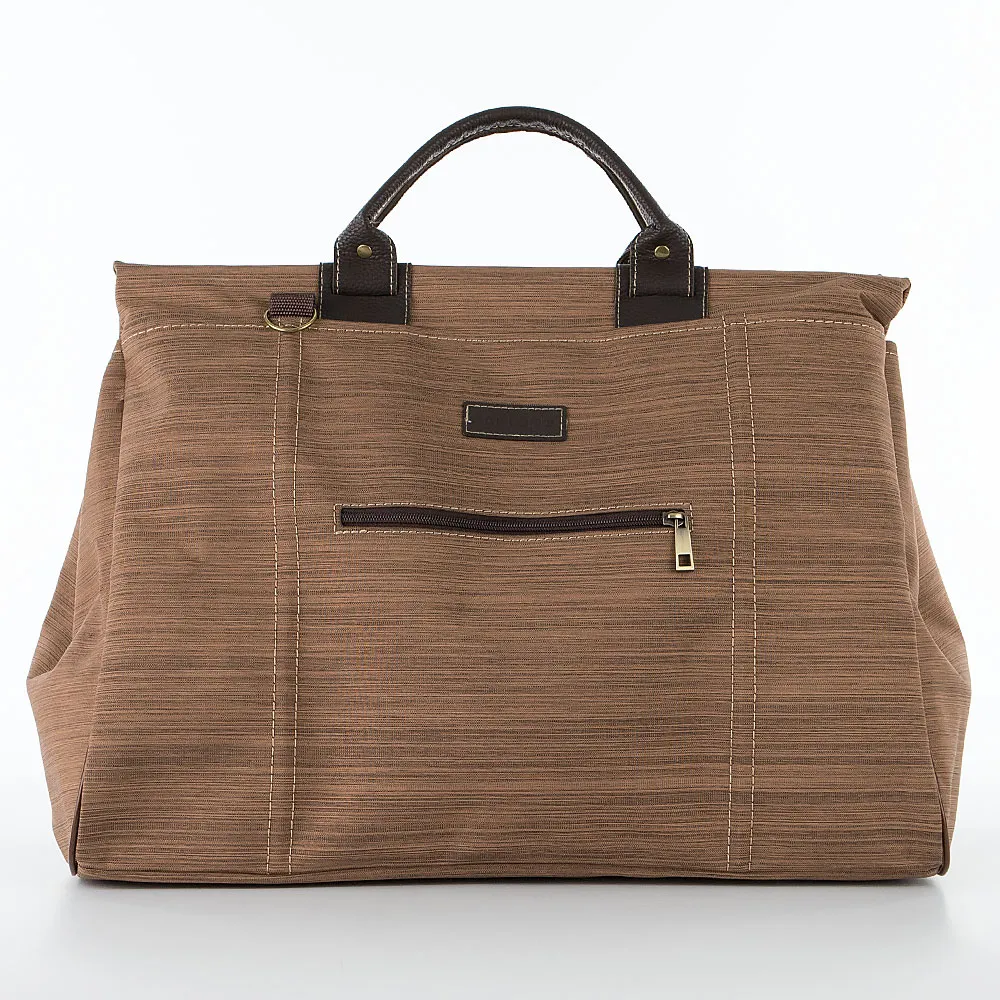Дорожно-спортивная сумка от торговой марки Ecotope из текстильного материала и искусственной кожи в светло-коричневом меланжевом цвете. Модель с двумя ручками и съемным плечевым ремнем. Отделение на молнии. Внутри: текстильная подкладка, два накладных кармана, перекрестные багажные ремни с застежкой фастекс. На лицевой и задней сторонах – карман на молнии. Дно оснащено металлическими ножками для защиты от износа.