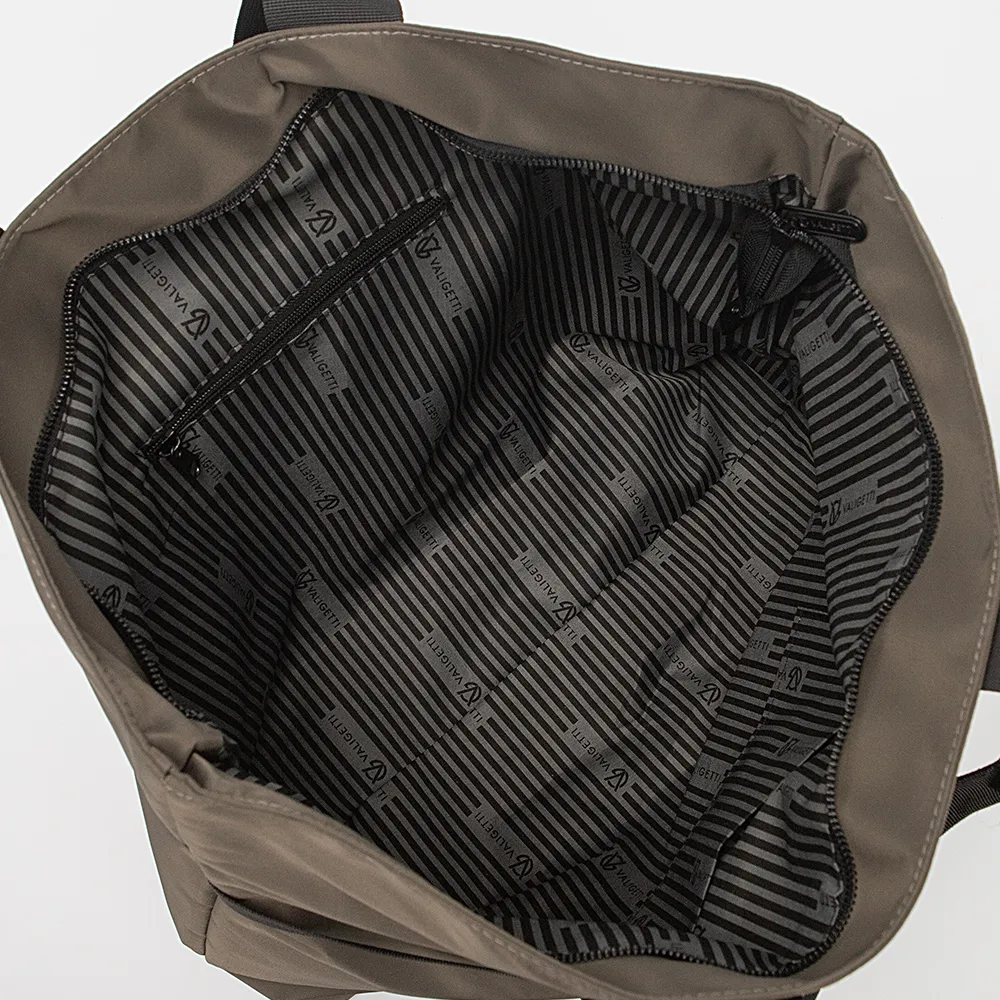 Дорожно-спортивная сумка от торговой марки Valigetti из прочного практичного текстильного материала цвета хаки. Модель с двумя удлиненными ручками. Отделение на молнии. Внутри: текстильная подкладка, карман на молнии, накладной карман. Лицевая сторона декорирована ремешками с застежкой фастекс. На задней стороне имеется лямка для крепления на выдвижную ручку чемодана.