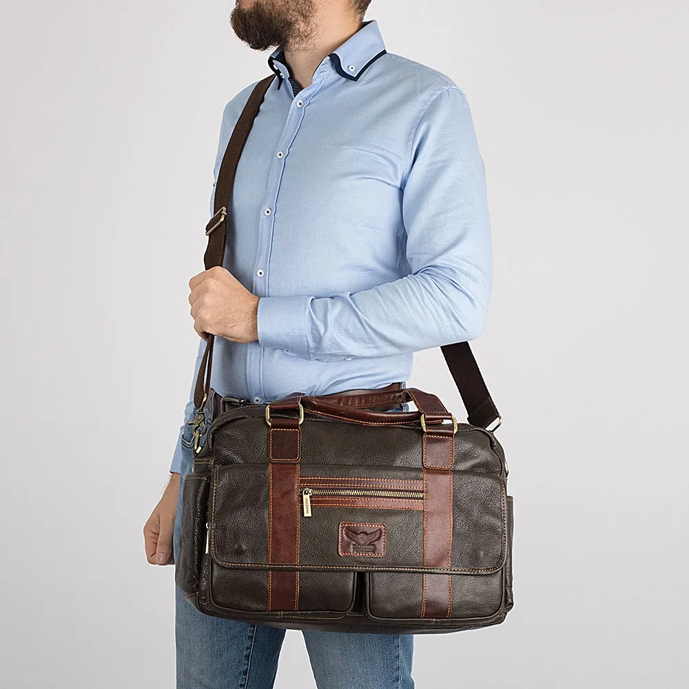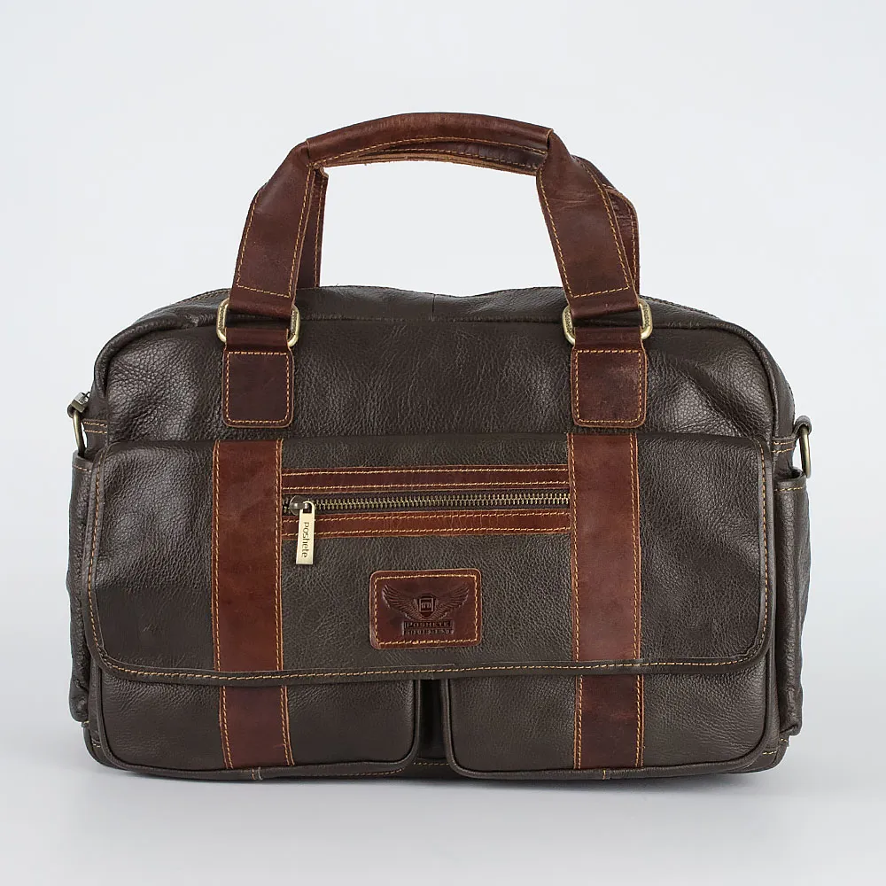 Стильная дорожная сумка для делового образа от бренда Poshete выполнена из натуральной кожи коричневого цвета. Модель прямоугольной формы, с плотной ручкой на кольцах-держателях и широким съемным плечевым ремнем. Вместительное отделение на молнии, с текстильной подкладкой. Внутри: карман на молнии, накладной карман для ноутбука, закрывающийся хлястиком на кнопку. На передней стороне – накладной карман с клапаном на двух магнитных кнопках. Клапан, декорированный вставками более яркого оттенка и нашивкой с эмблемой и названием бренда, также закрывает карман на молнии и два накладных кармана на молнии. По бокам сумки – карманы на магнитной кнопке. На задней стороне – карман на молнии по всей длине сумки, снизу имеется молния, благодаря которой карман превращается в плечевую лямку для фиксации на ручку чемодана. Молнии с кожаными пуллерами. Сумка декорирована контрастной отстрочкой.