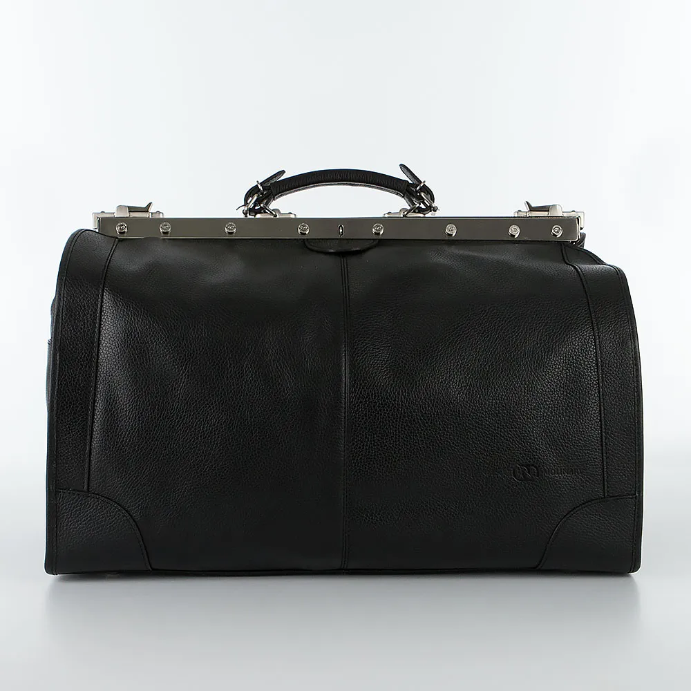 Вместительный саквояж от торговой марки Francesco Molinary из натуральной кожи черного цвета с фирменной металлической фурнитурой. Модель с плотной ручкой, с надежным рамочным замком, благодаря которому обеспечивается комфортный доступ внутрь. Внутри: фирменная подкладка, два кармана на молнии. На задней стороне – карман на молнии. Саквояж подчеркнет вкус и статус своего владельца.