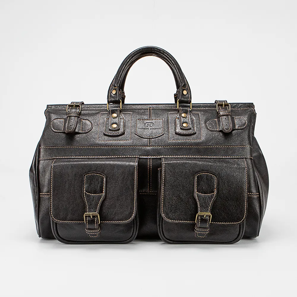 Дорожно-спортивная сумка-саквояж от торговой марки Francesco Molinary из натуральной кожи коричневого цвета с контрастной отстрочкой. Модель с двумя плотными ручками и съемным регулируемым плечевым ремнем, выполненным из текстильного материала. Отделение на молнии имеет рамочный тип закрытия, что обеспечивает удобный доступ; дополнительно закрывается двумя ремешками с пряжками. Внутри: фирменная подкладка, вместительный карман на молнии. На лицевой стороне – два накладных кармана. Ручки и ремешки дополнительно укреплены хольнитенами. Дно оснащено металлическими ножками для защиты от износа.