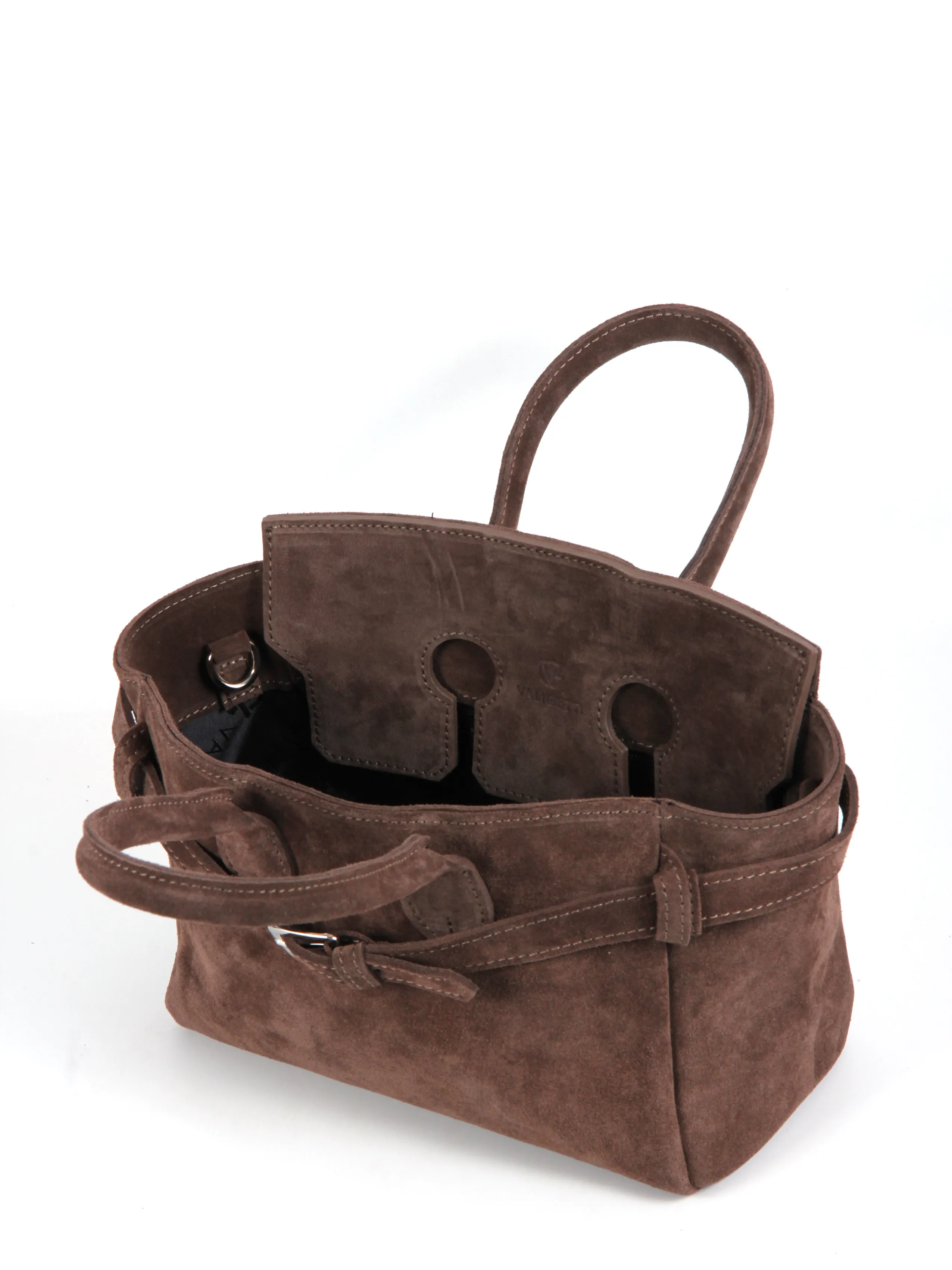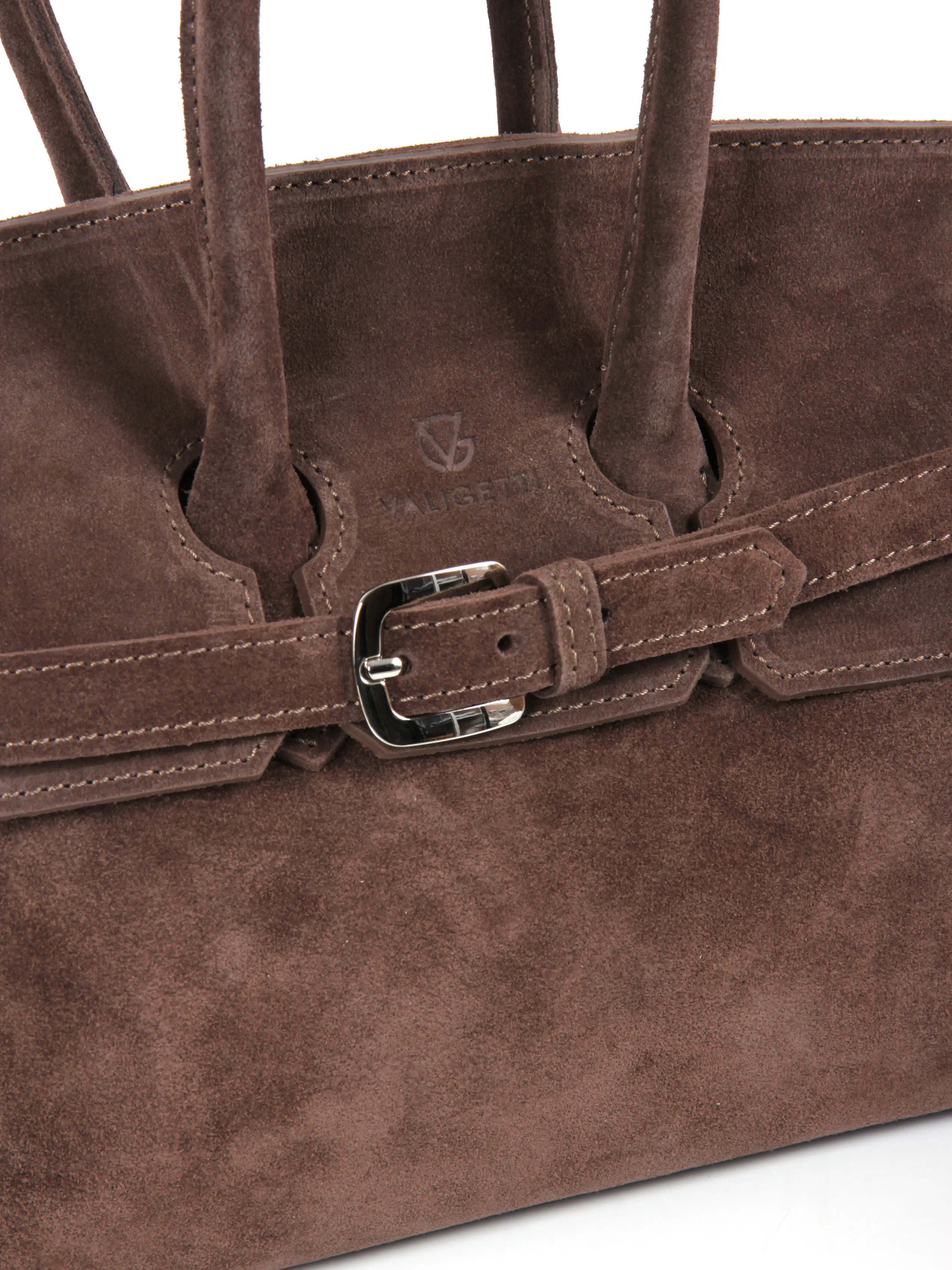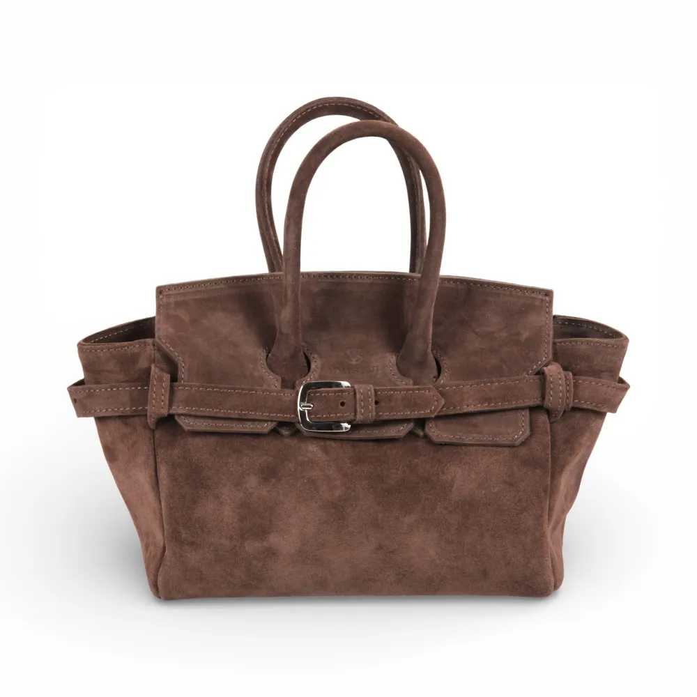 Сумка от бренда Valigetti выполнена из натуральной замши в коричневом цвете. Модель с двумя ручками и съемным регулируемым плечевым ремнем. Внутри фирменный текстильный подклад, накладной открытый карман и боковой карман на молнии. Дно оснащено металлическими ножками для защиты от износа.