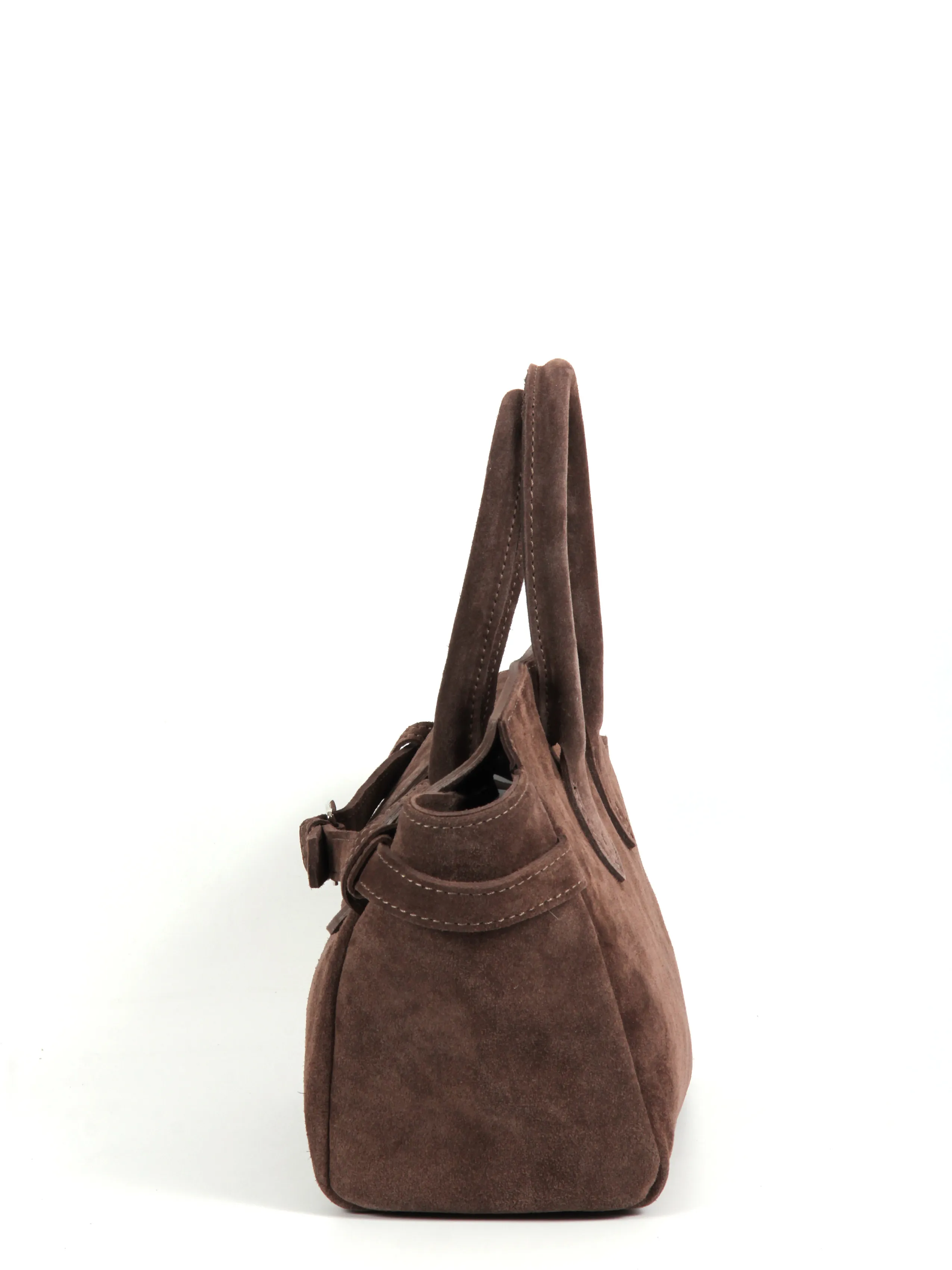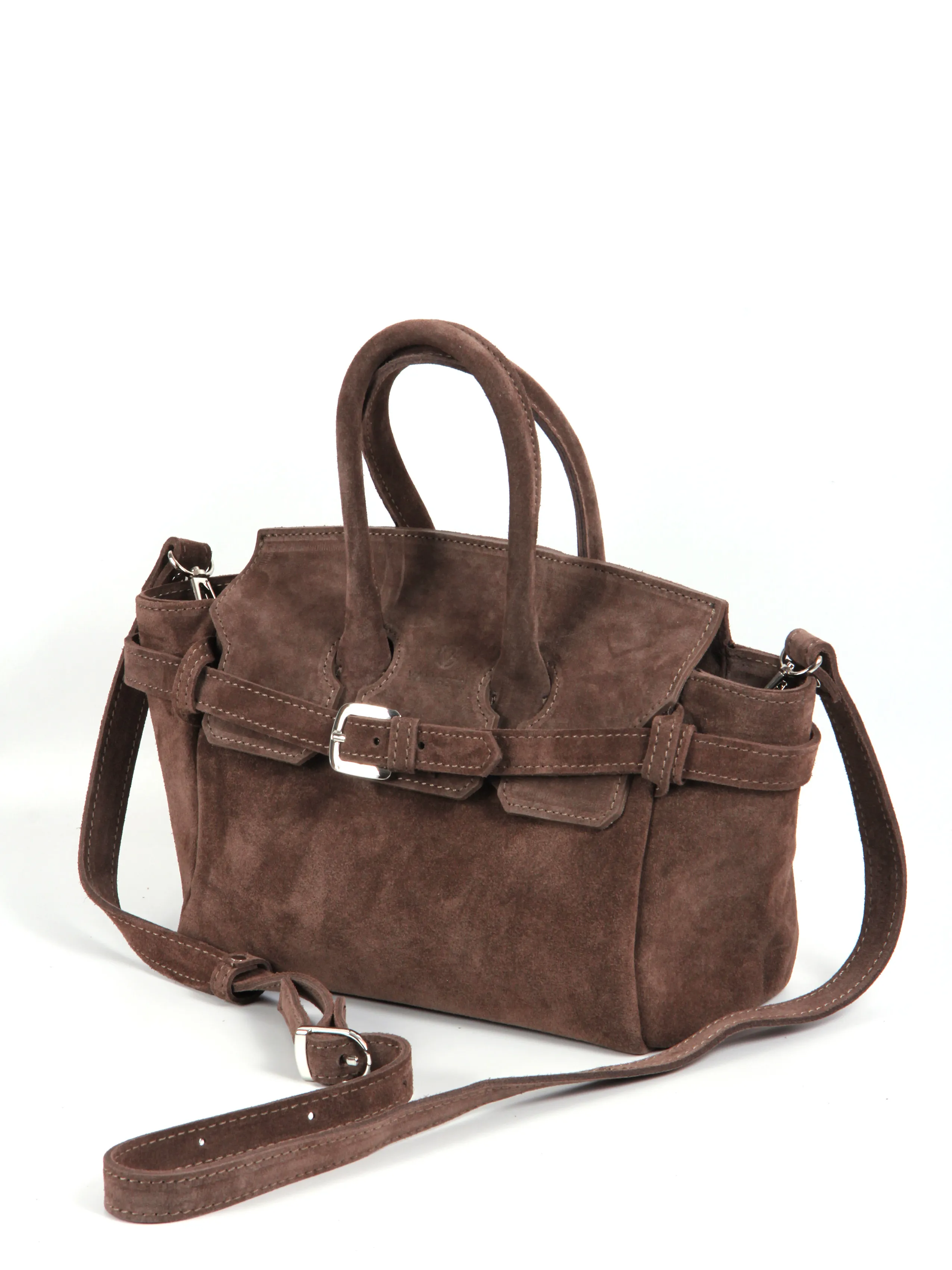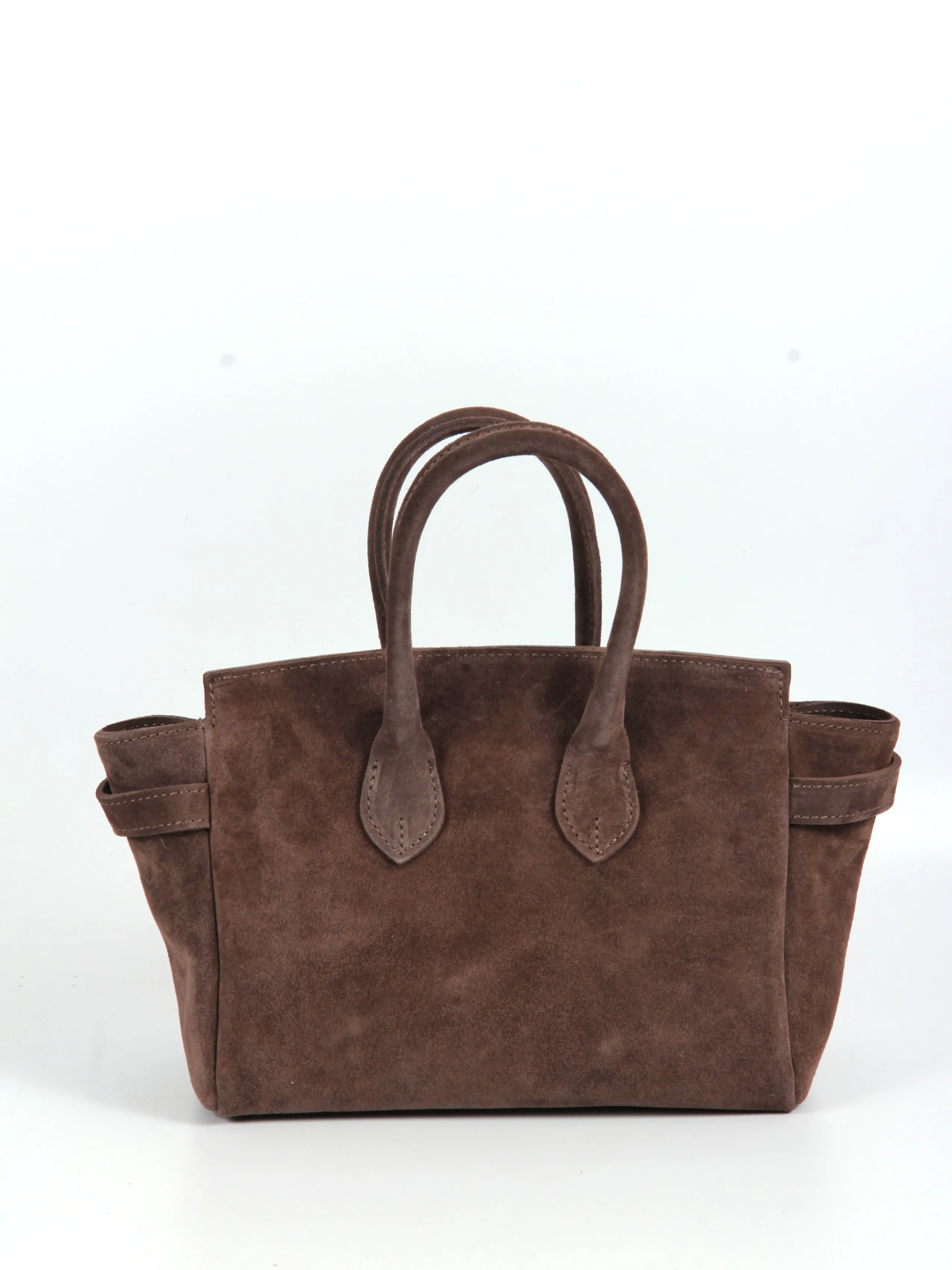 Сумка от бренда Valigetti выполнена из натуральной замши в коричневом цвете. Модель с двумя ручками и съемным регулируемым плечевым ремнем. Внутри фирменный текстильный подклад, накладной открытый карман и боковой карман на молнии. Дно оснащено металлическими ножками для защиты от износа.