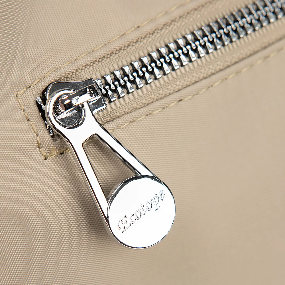 Сумка от бренда Ecotope из практичного текстильного материала бежевого цвета. Модель с длинной ручкой и съемным регулируемым плечевым ремнем. Отделение на молнии, с текстильной подкладкой. Внутри карман на молнии и накладной карман. На задней стороне — карман на молнии.