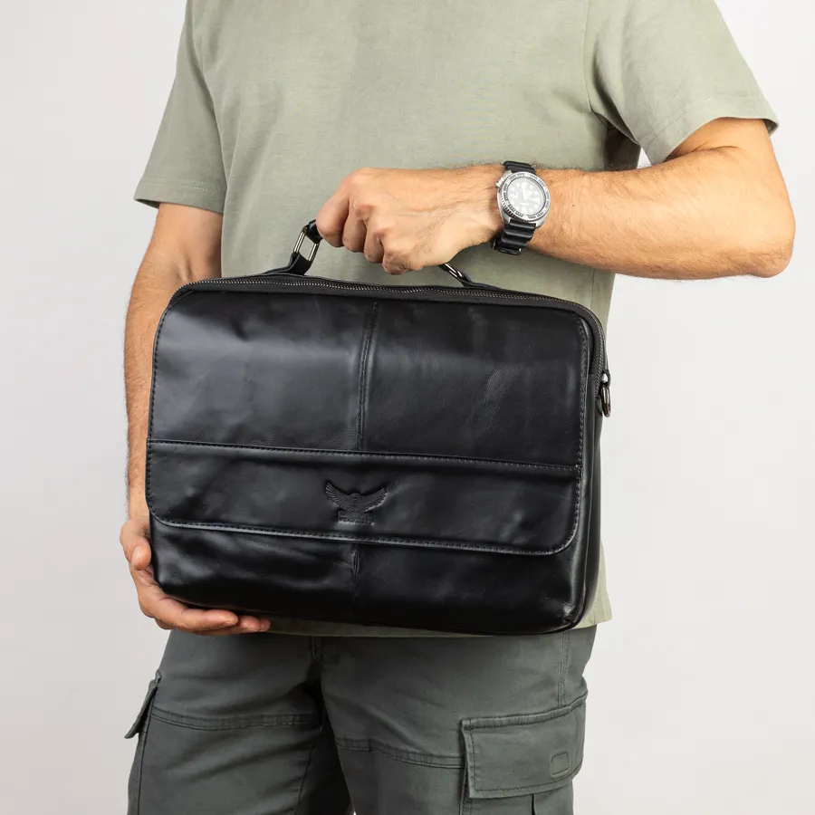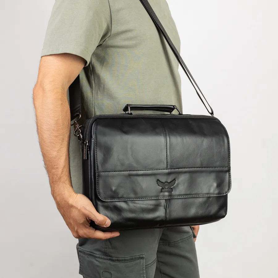 Мужской портфель бренда Poshete из гладкой натуральной кожи черного цвета. Прошит внутри фирменной подкладкой. Одно отделение на молнии с карманом внутри. Также отделение для документов, защищенное клапаном на магнитах. С задней стороны карман на молнии. В комплекте есть регулируемый плечевой ремень
