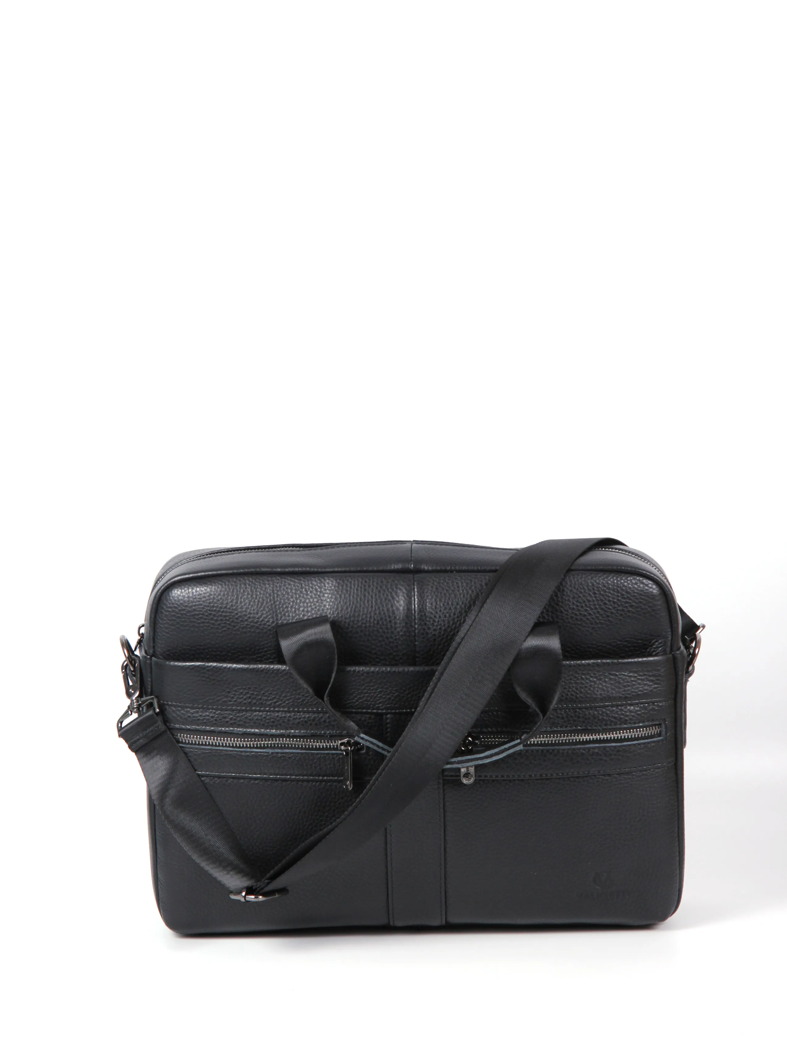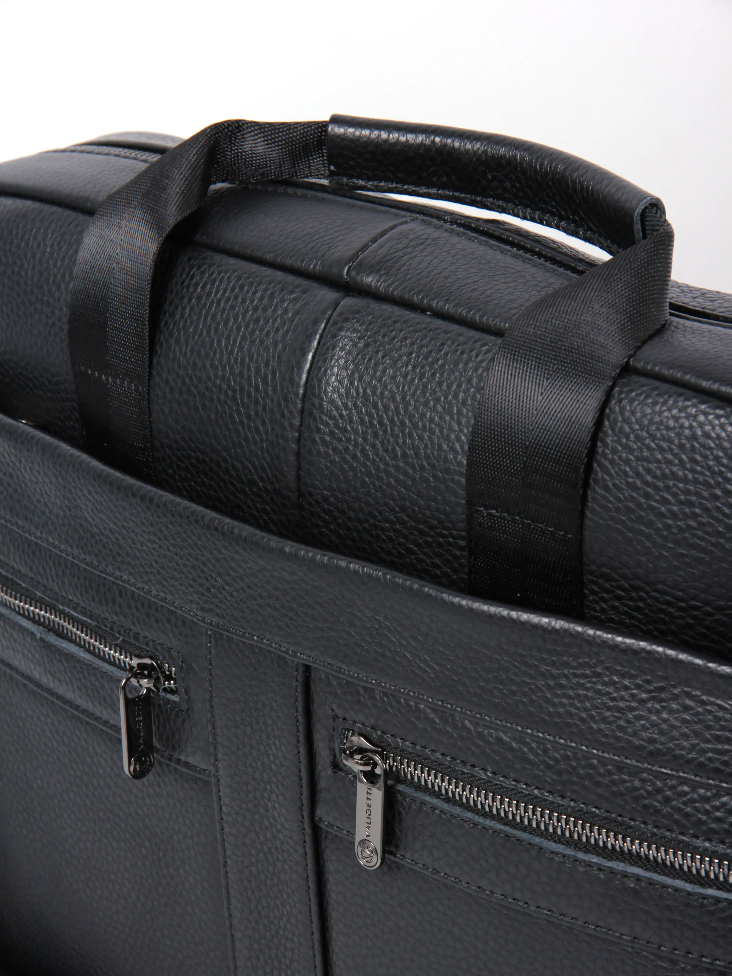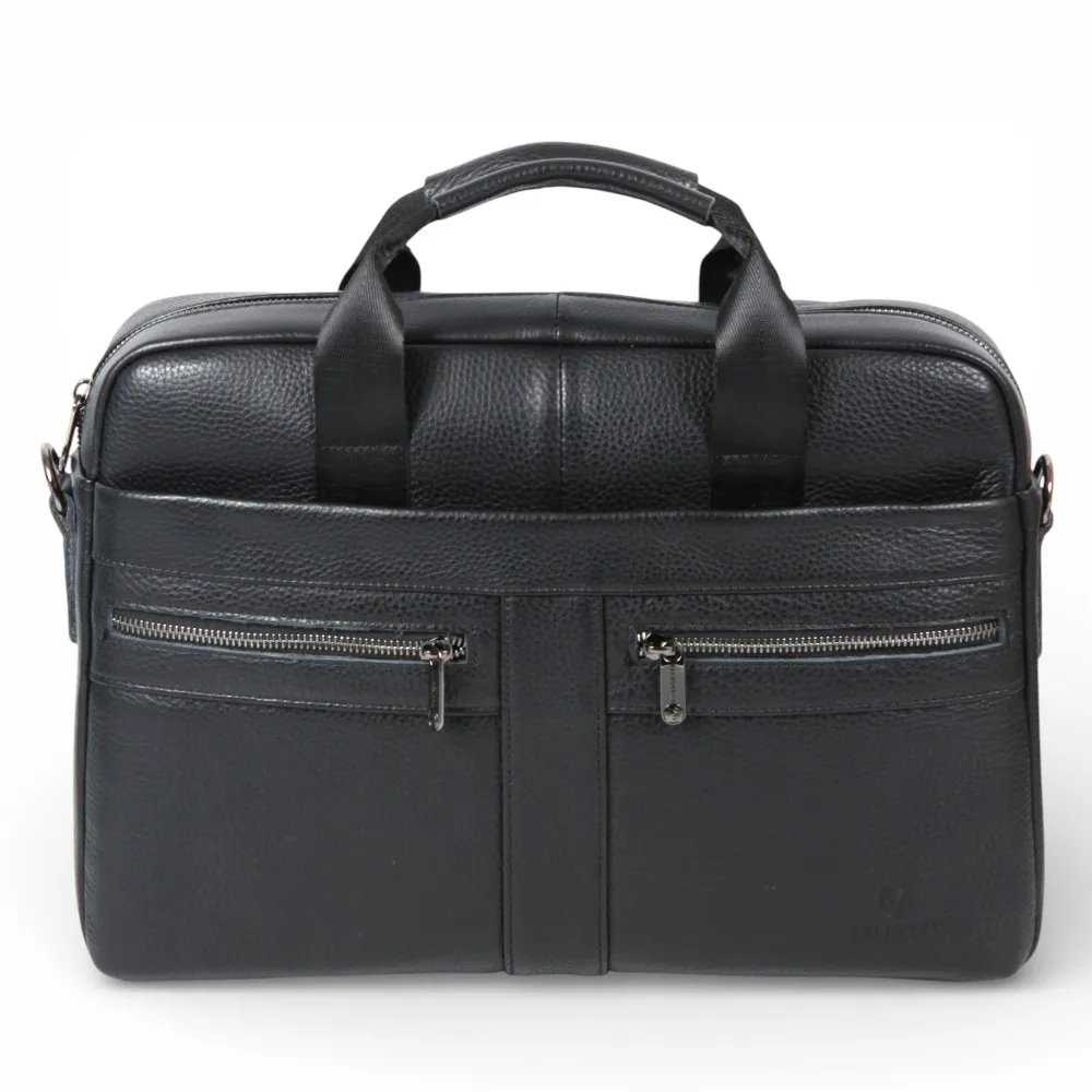 Деловая сумка от бренда Valigetti выполнена из натуральной кожи в черном цвете. Модель с двумя ручками и съемным текстильным регулируемым плечевым ремнем. Основное отделение на молнии, внутри: фирменная текстильная подкладка, два накладных открытых кармана, карман на молнии и накладной карман фиксируется хлястиком на липучке. На лицевой стороне сумки расположено два маленьких кармана на молнии и один большой карман на молнии, на задней стороне сумки расположен большой карман быстрого доступа на молнии.