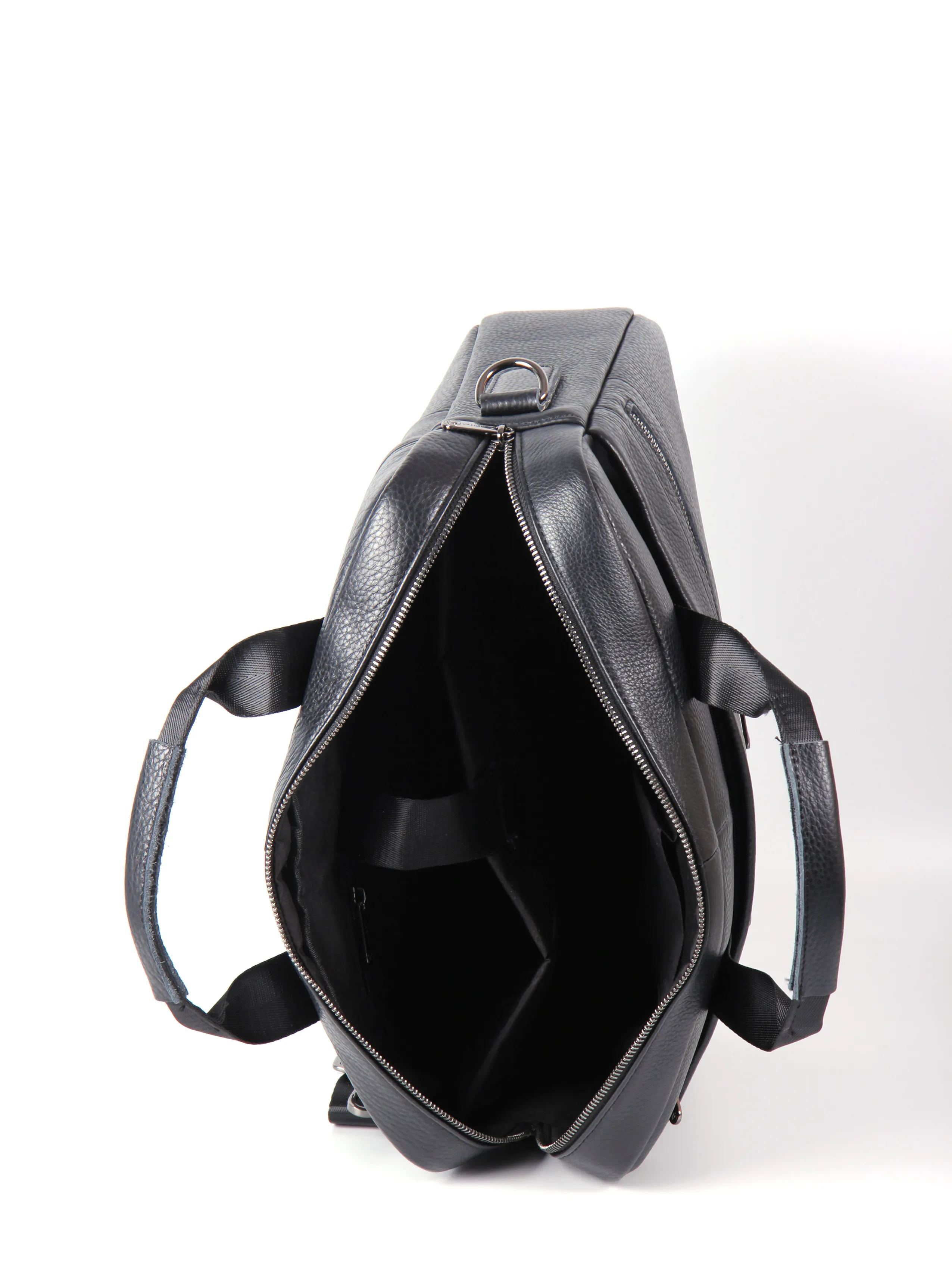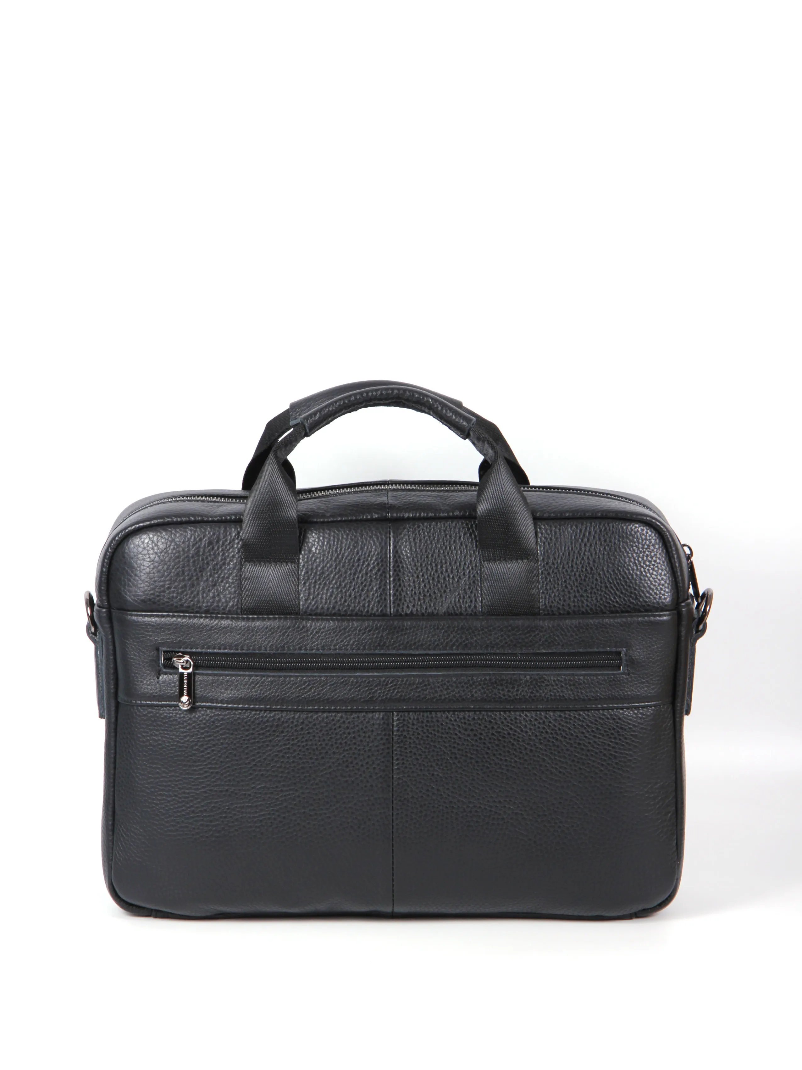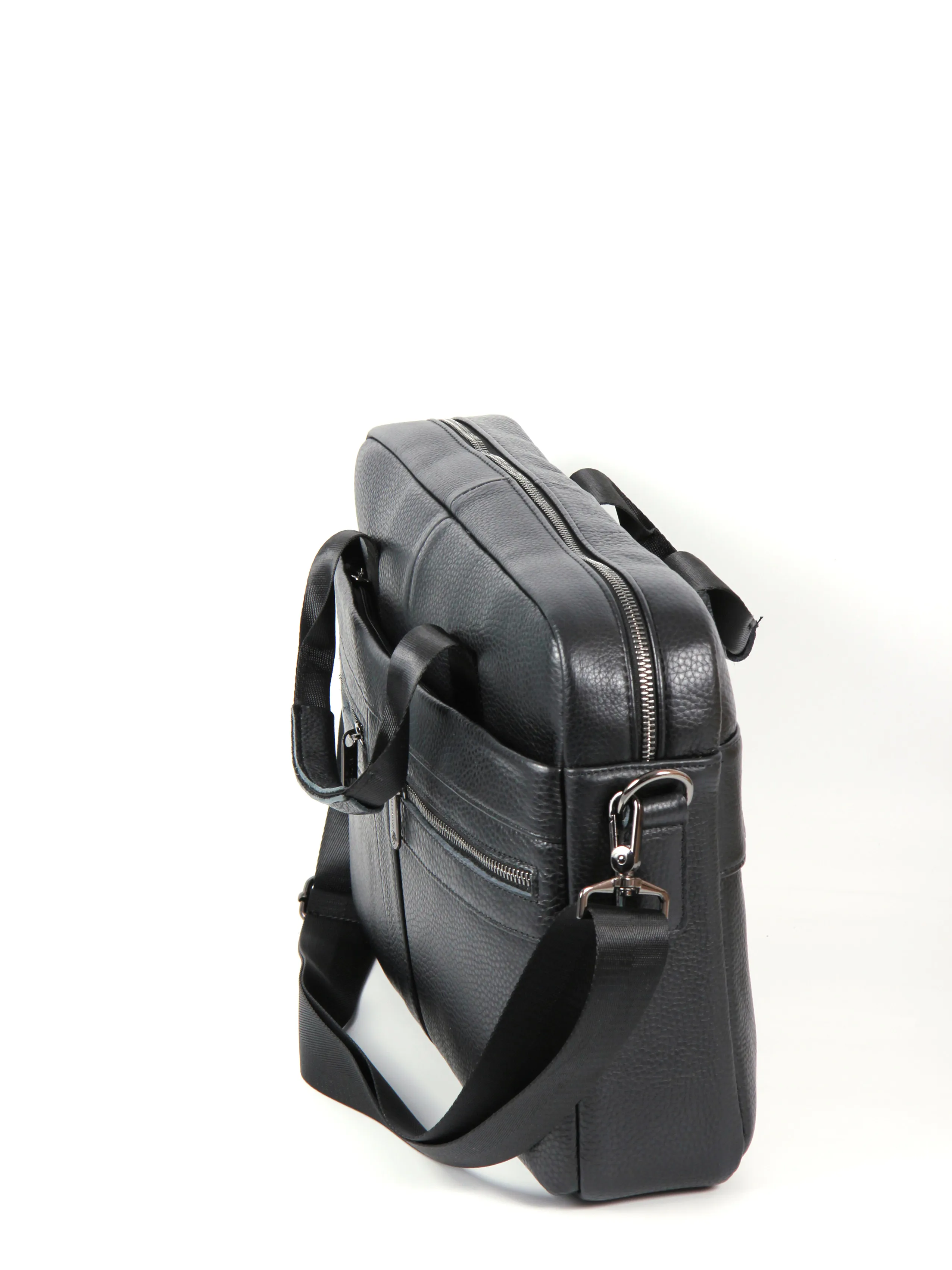Деловая сумка от бренда Valigetti выполнена из натуральной кожи в черном цвете. Модель с двумя ручками и съемным текстильным регулируемым плечевым ремнем. Основное отделение на молнии, внутри: фирменная текстильная подкладка, два накладных открытых кармана, карман на молнии и накладной карман фиксируется хлястиком на липучке. На лицевой стороне сумки расположено два маленьких кармана на молнии и один большой карман на молнии, на задней стороне сумки расположен большой карман быстрого доступа на молнии.