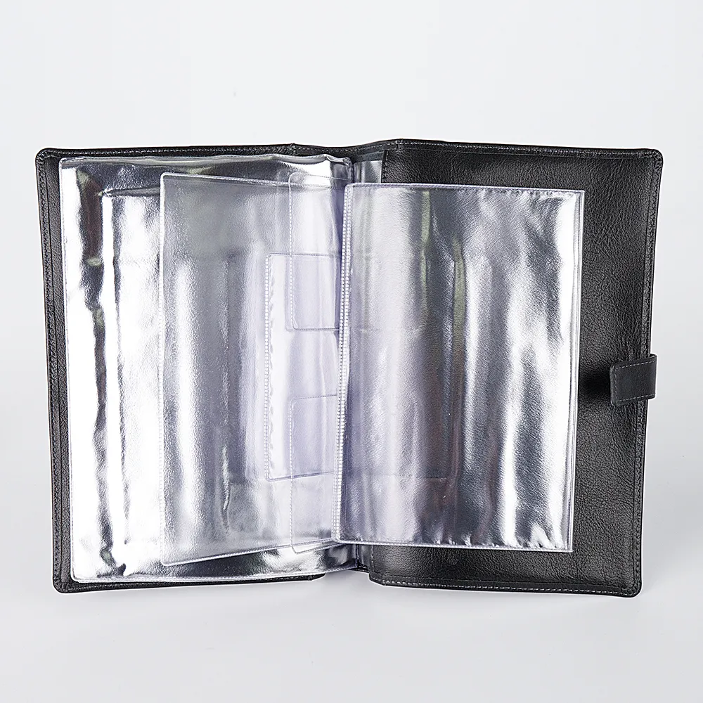 Классическая папка для документов от бренда Poshete. Аксессуар чёрного цвета из натуральной мягкой кожи. Модель закрывается ремешком на кнопке. Внутри мягкие пластиковые разно размерные вкладыши для документов. По два вкладыша для каждого из документов: медицинский полис нового образца, медицинский полис старого образца, свидетельство о рождении, СНИЛС, ИНН.